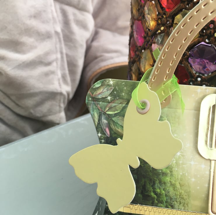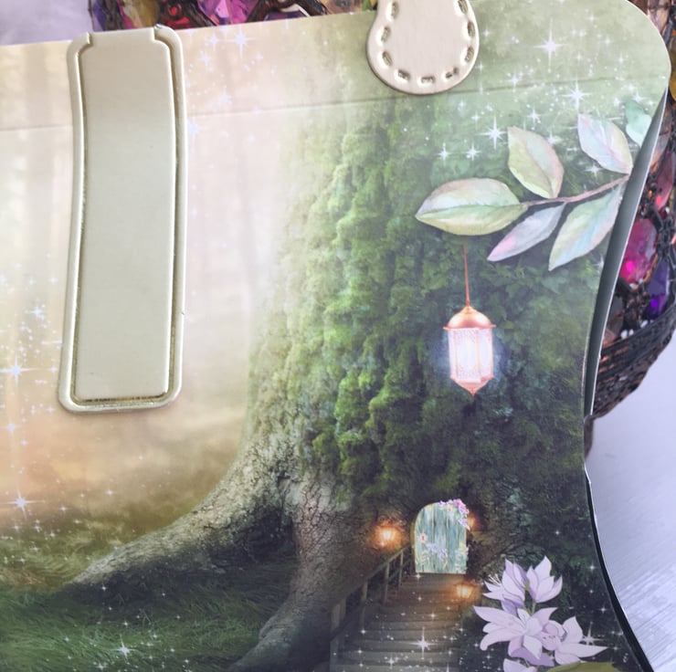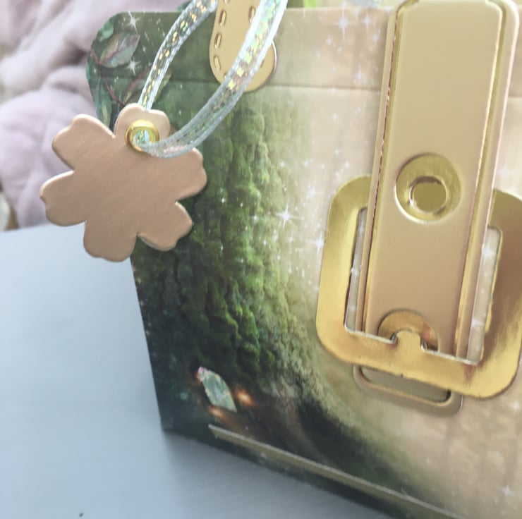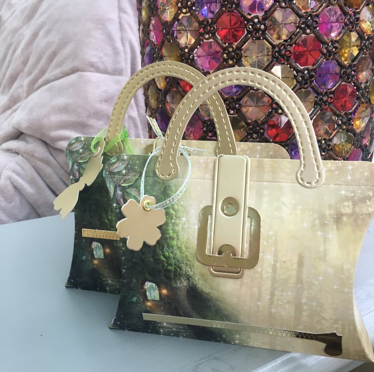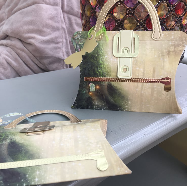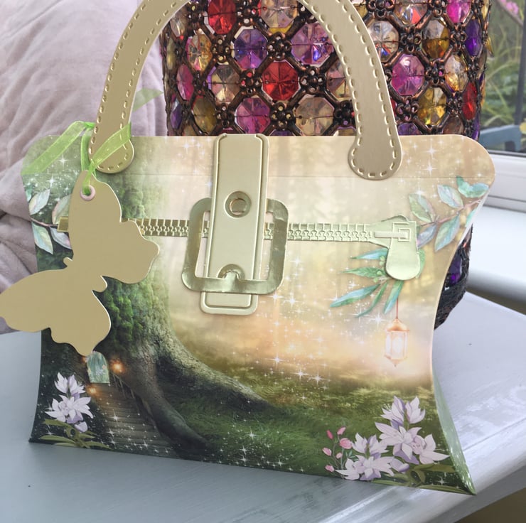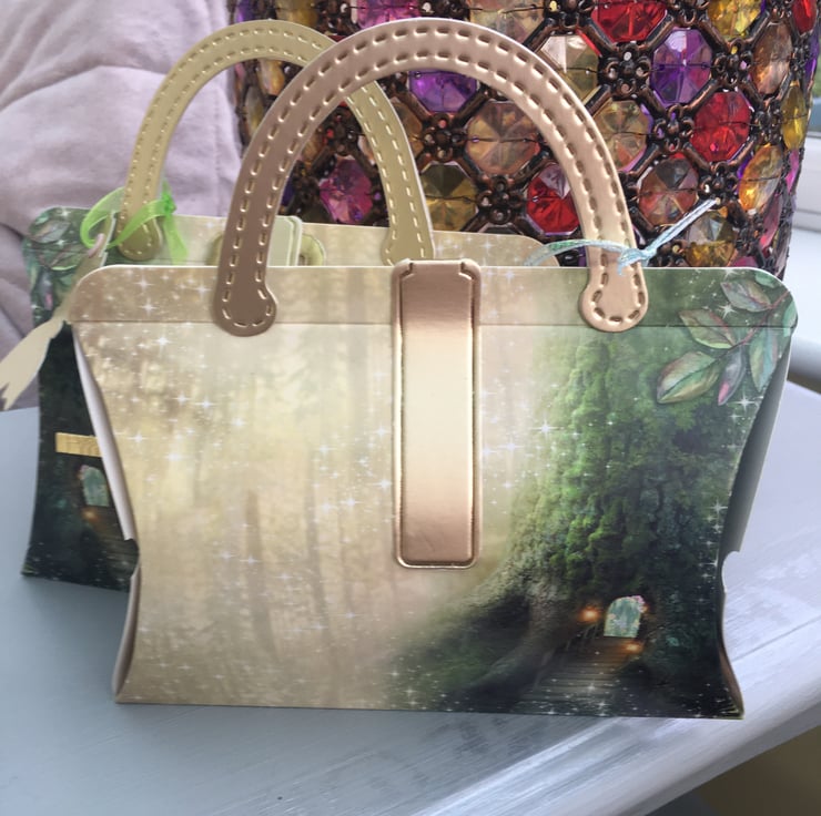 An unusual way to send a special gift. A pillow box in a handbag style. This 5.5x4.5inch box has a sparkly forest design with a moss covered tree, this has a staircase leading to a welcoming fairy door. The handbag design is finished with gold card hardware and a tag hanging on the handle, one has a butterfly the other has a flower. There are 2 available.