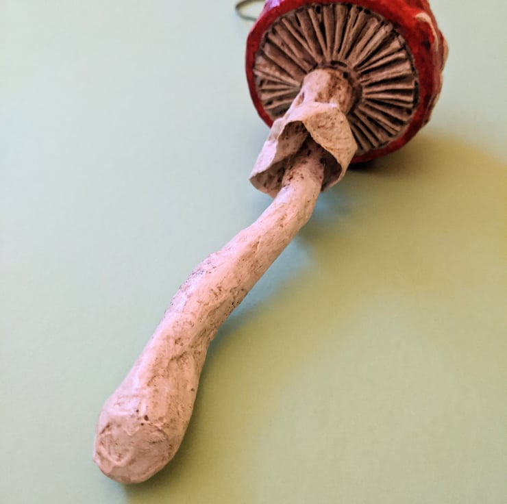 Distinctive red and white toadstool made using paperstrip papermache technique. Hung on a green ribbon. Perfect for halloween or Autumnal decoration, or for anyone who just loves toadstools!