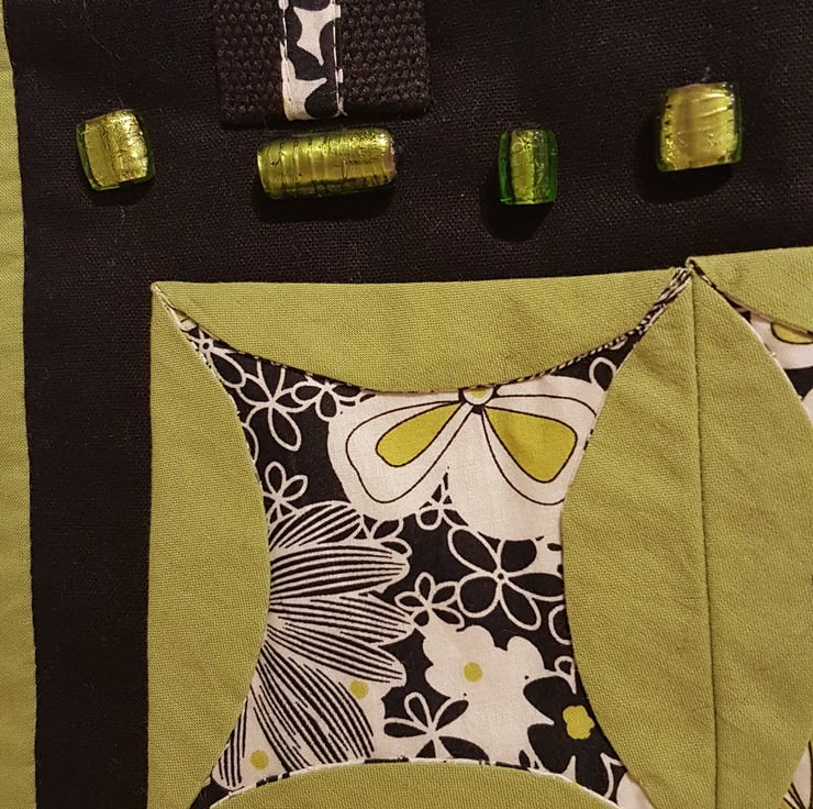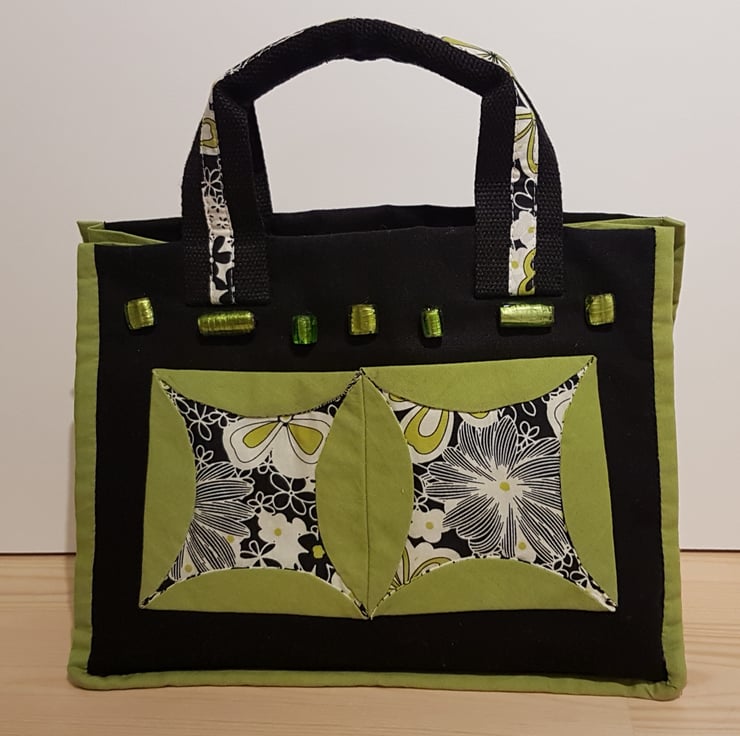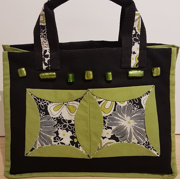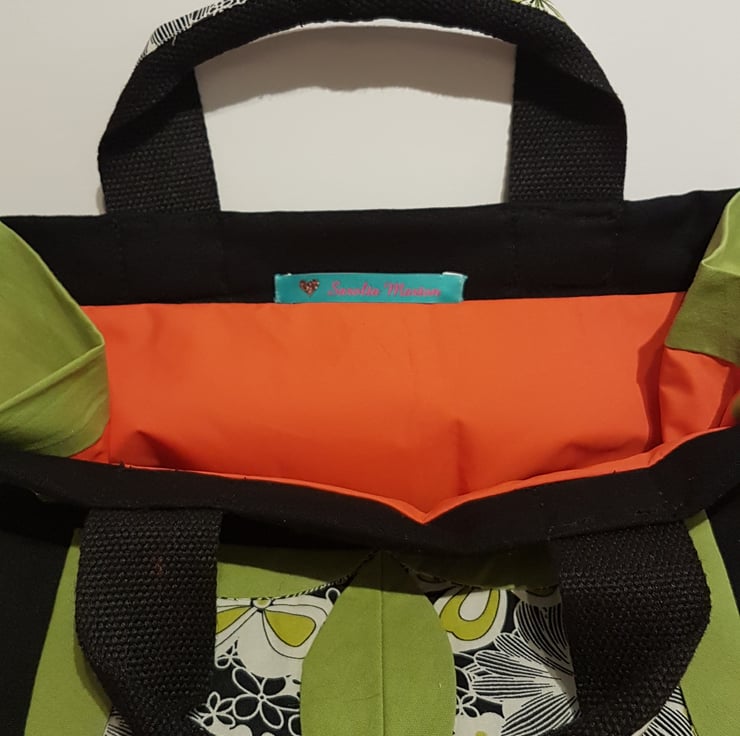 Hancrafted patchwork handbag with lime and ivory flowers on the front and on the straps,decorated with lime green glass beads.The bag has bright orange waterproof lining,ideal for lunch holder bag.Materials: Cotton nd policotton outside and waterproof lining inside,cotton webb ing handles with cord inner on the top of on the handle.Dimensions:hight:20cm,width:27cm,depth:11cm,handle:27cm.