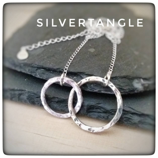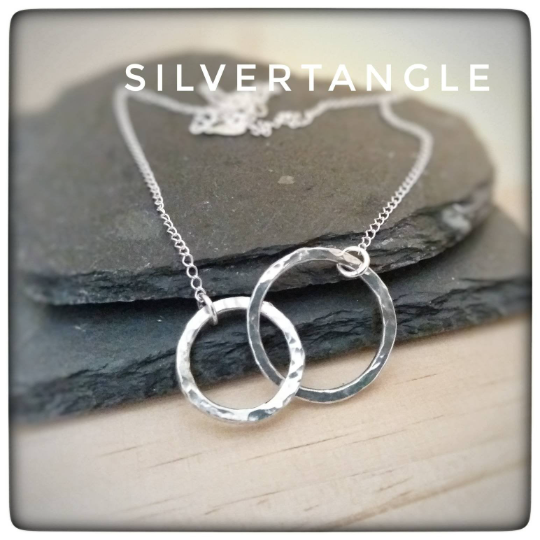 I have connected two thick sterling silver rings together to form an interlocking ring pendant. Each ring has been cut, shaped, soldered and then hammered to give a textured effect. I have then polished them up to give a great shine and the texturing helps the rings catch the light. The rings have been made from 2mm thick solid sterling silver wire so are nice and chunky.