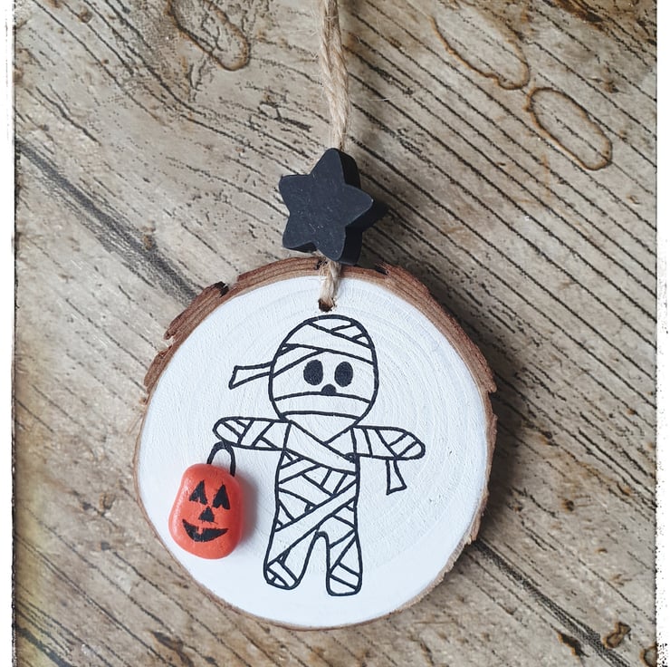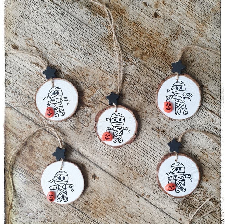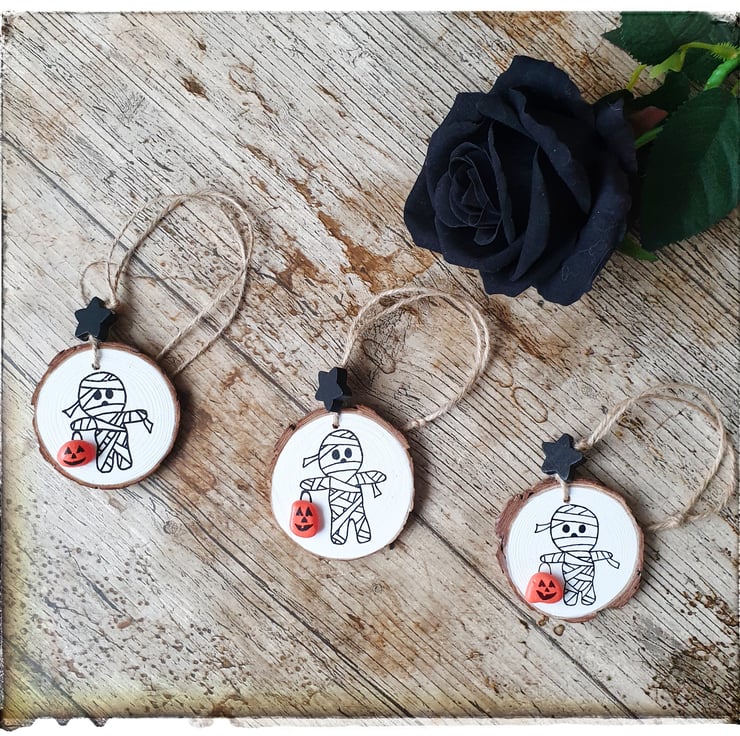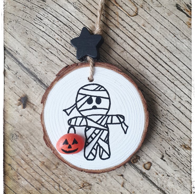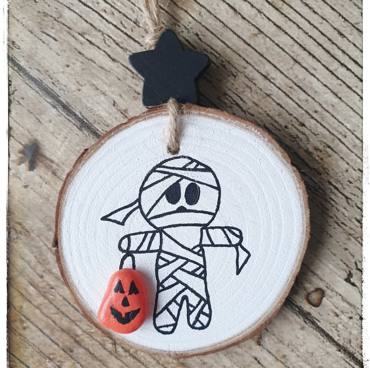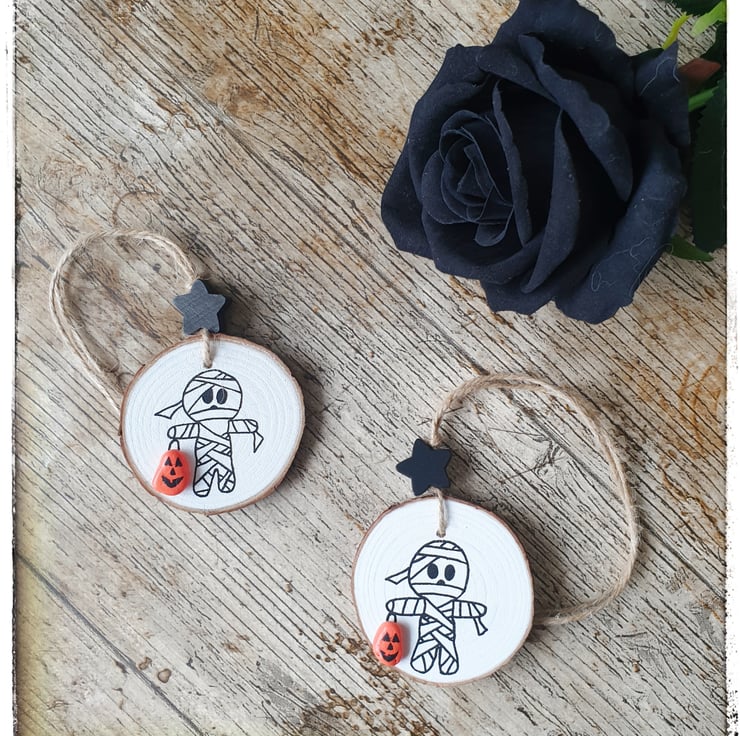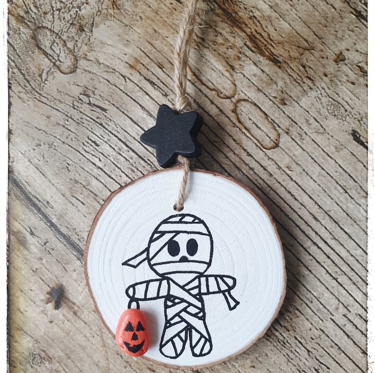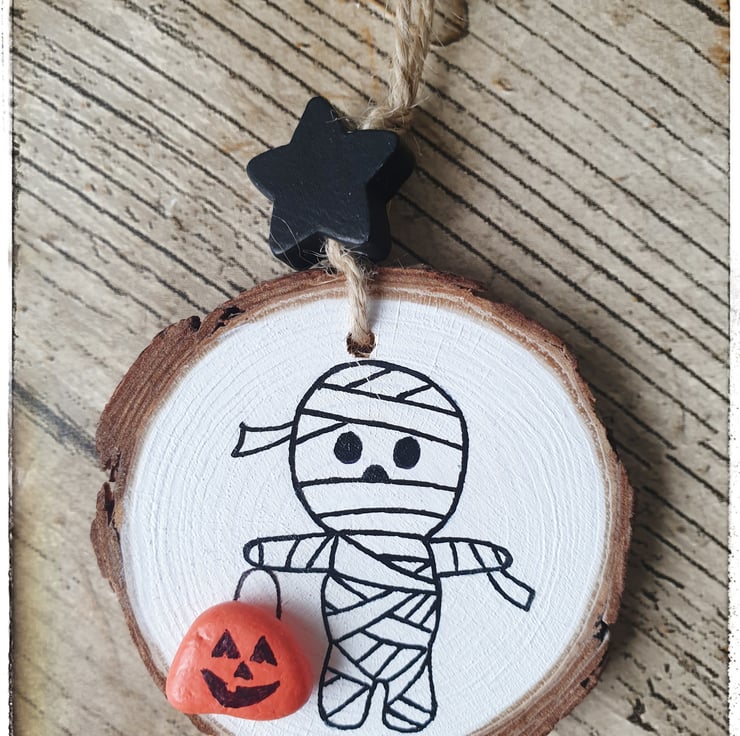 These cute mummies are drawn with black acrylic pen and are holding seaglass pumpkins. The seaglass are painted in orange with faces drawn on. A black wooden star is added to each ornament. Each woodcuts measures appropriately 6cm-7cm.