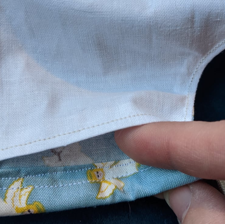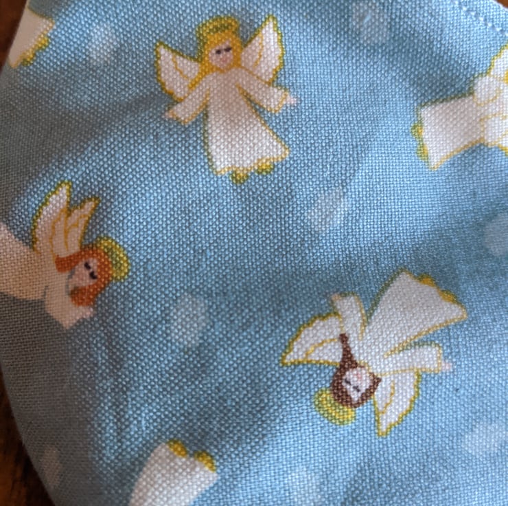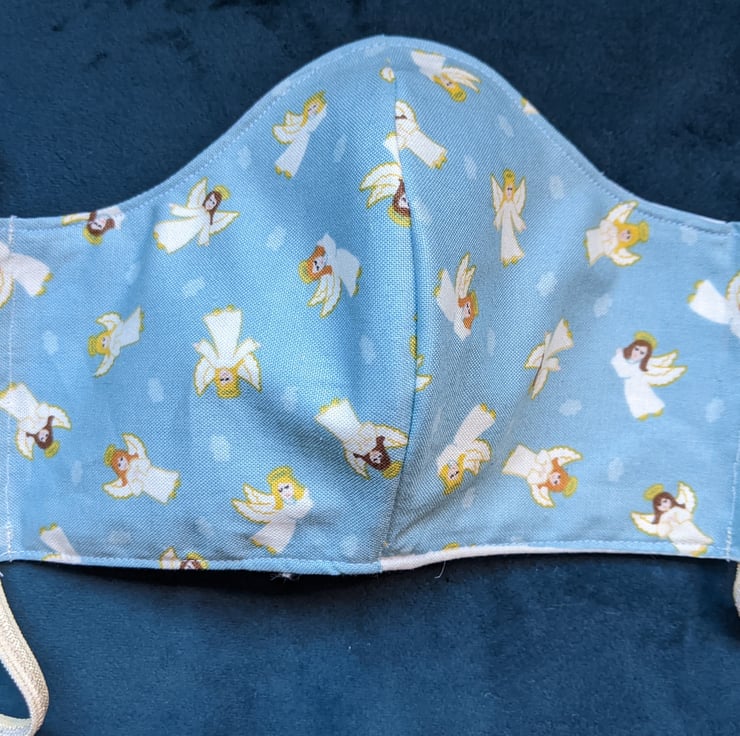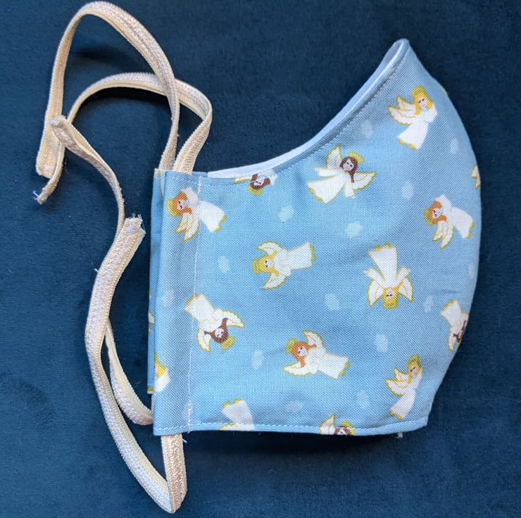 This is a face covering with elastic ties. It is made of 100% cotton with a pattern of angels with haloes and wings, on a pale blue background, with a white lining.