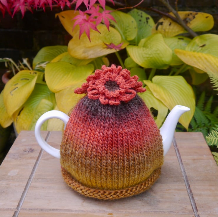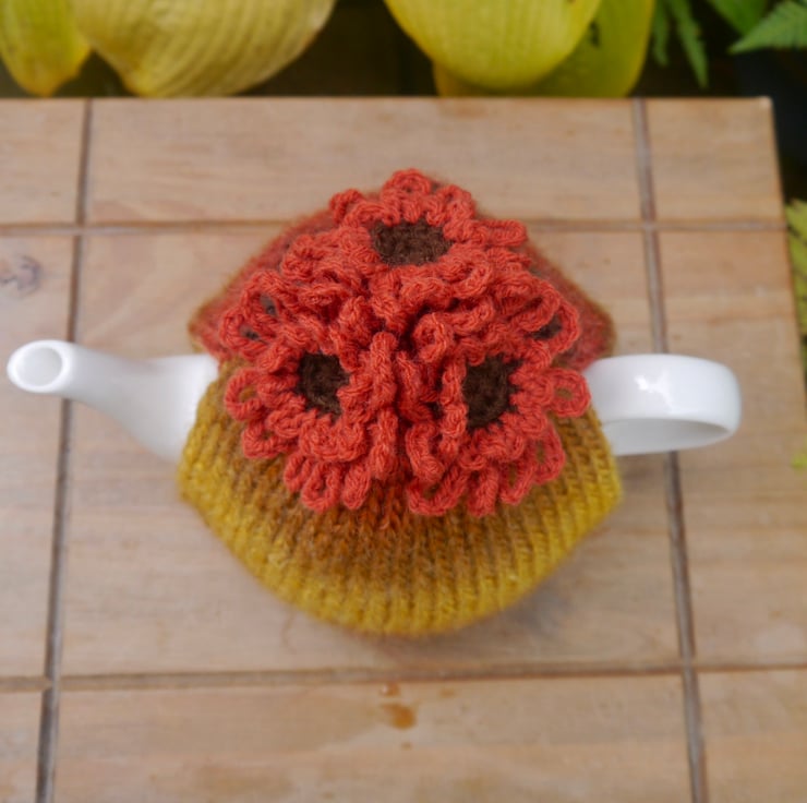 Autumnal orange crochet flowers adorn this autumnal hand knitted tea cosy.
