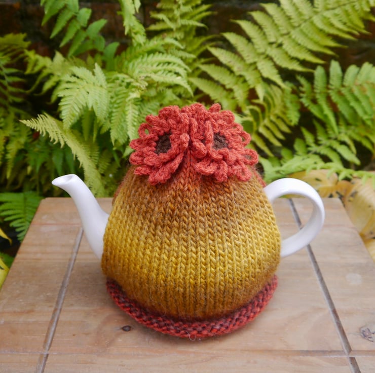 I have crocheted three burnt orange daisy flowers which have dark brown centres. These are made using a mixture of wool and acrylic yarns. The tea cosy base is knitted with a lovely soft wool mix yarn in marbled autumnal colours of gold, orange and brown. It will fit a standard 4-6 cup teapot.