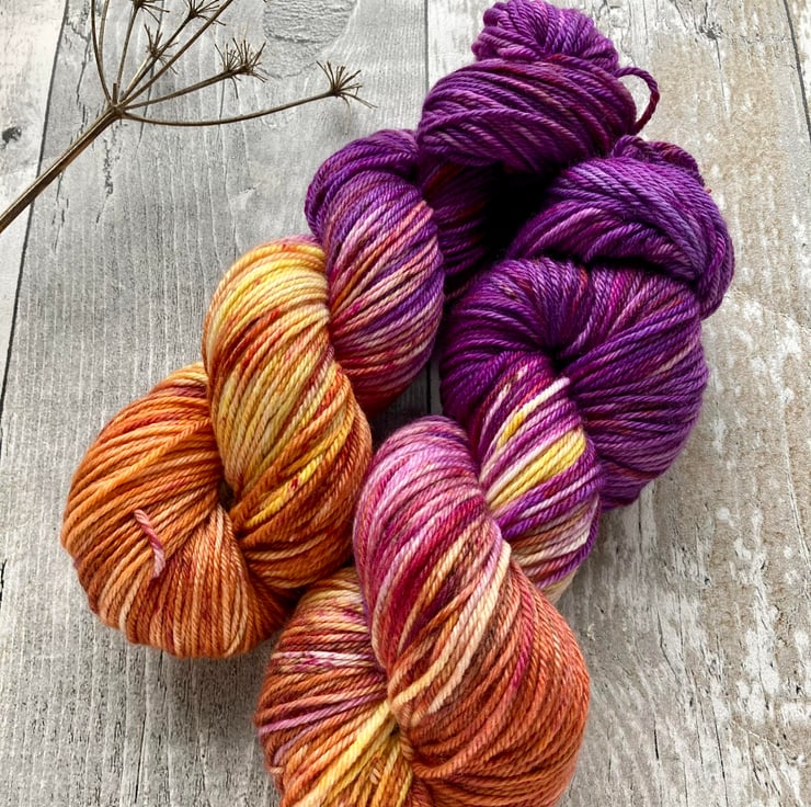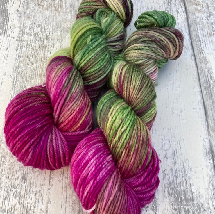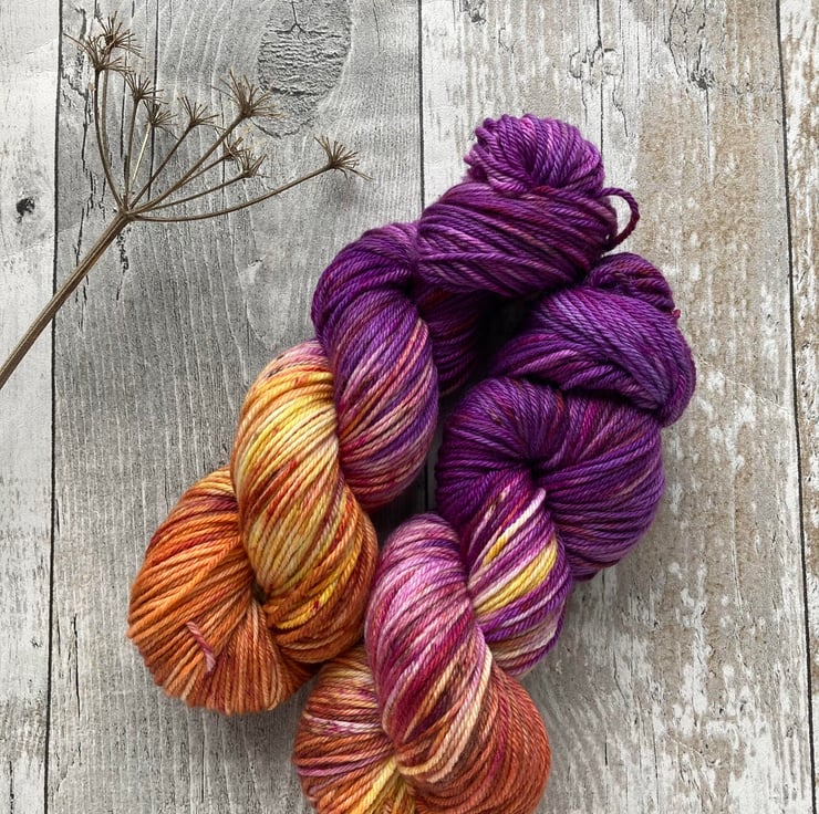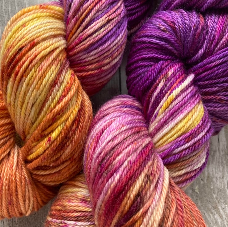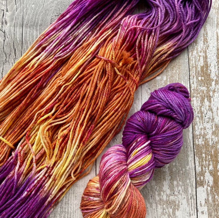 Skein of hand dyed merino cashmere nylon 80/10/10 yarn as shown.