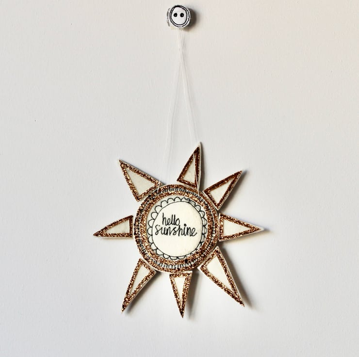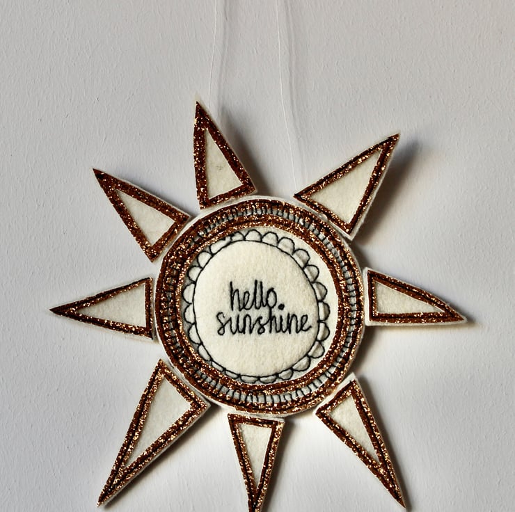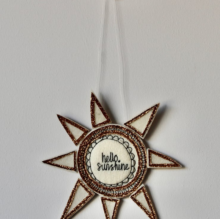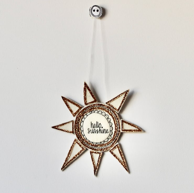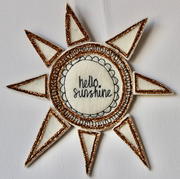 Each sunshine is sewn using 100% wool felt, glitter cloth and free hand machine embroidery; multiple layers of cloth are sewn together and cut out by hand using very sharp scissors. With a linen string to suspend.