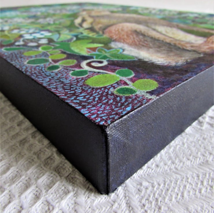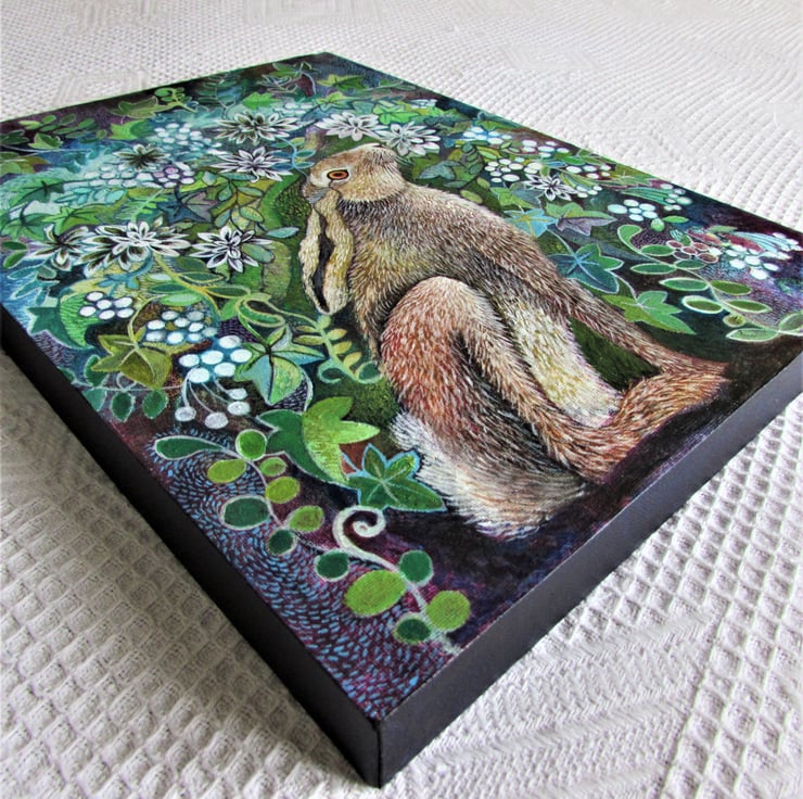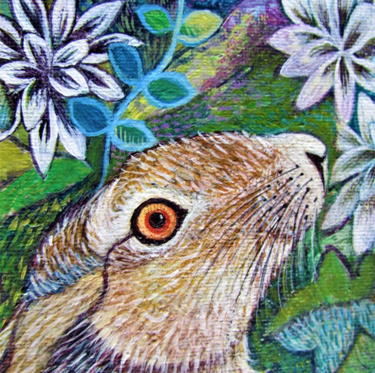 This painting of a hare hiding in a flowery bower is in acrylic paint on a 40.5cm x 30.5 deep edge (3.3cm) canvas. It is supplied with metal hanging rings ready for display. Its style is inspired by the dense richness of the hedgerow, the green man ceremony in Glastonbury and the intricate designs of William Morris.