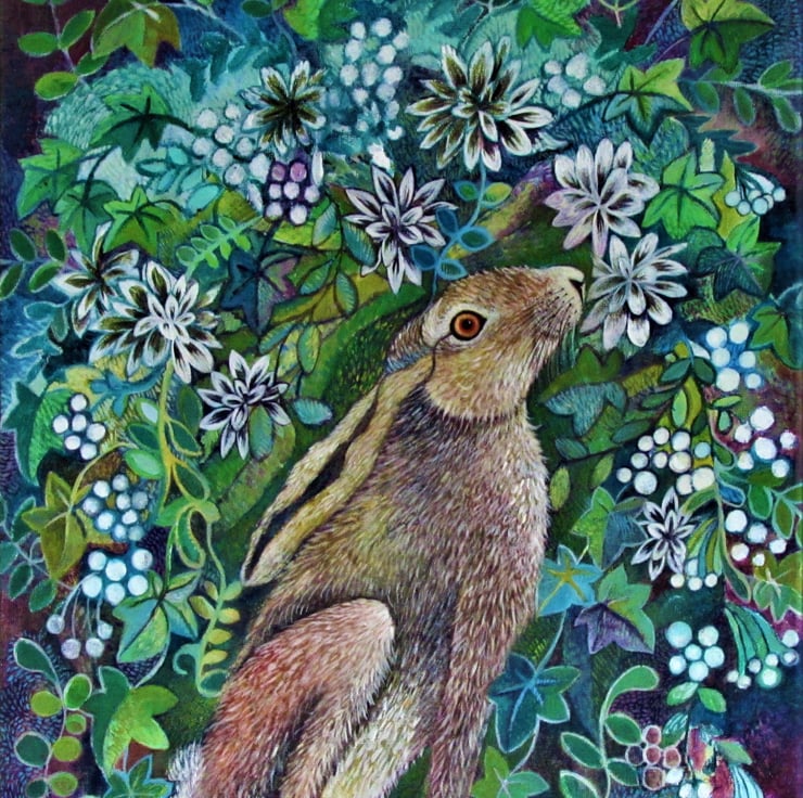 Originally I was inspired by the Green Man celebrations in Glastonbury and the floral crowns worn by the participants and then on holiday in Scotland I saw a hare sitting very still beside the road yet poised to move very fast. And so I combined the two images. The purple background gave the plants depth...the darkness behind...while the hare enjoys a moment in the flowers before moving on.