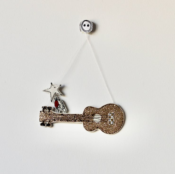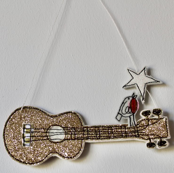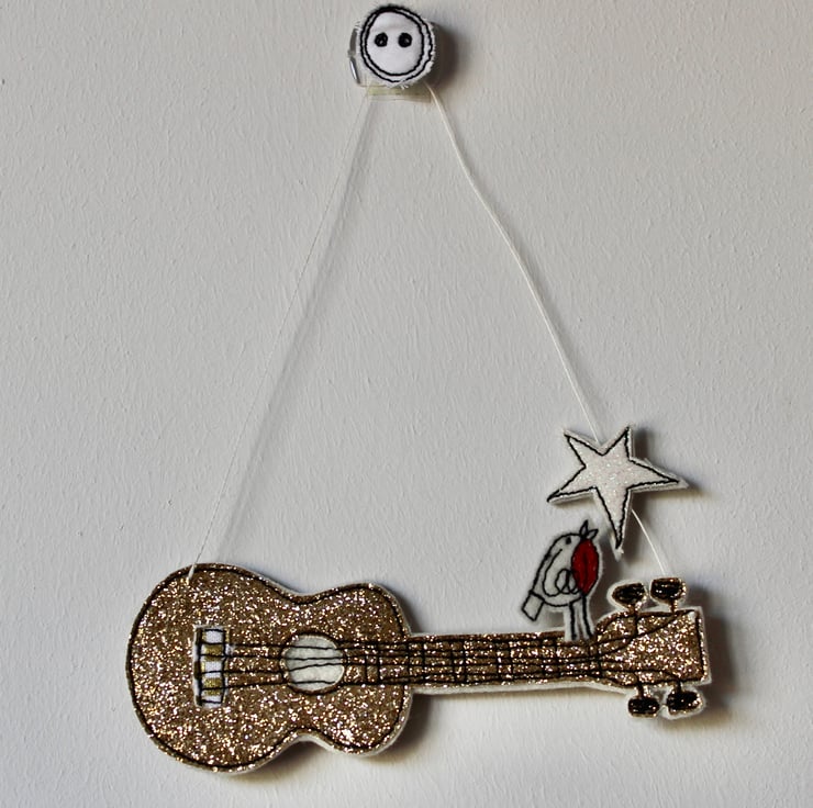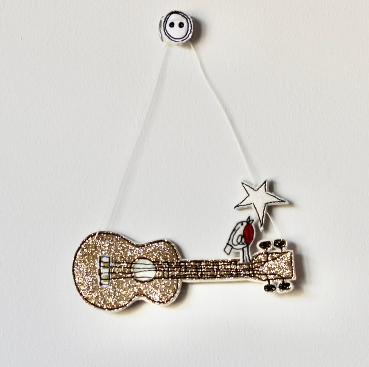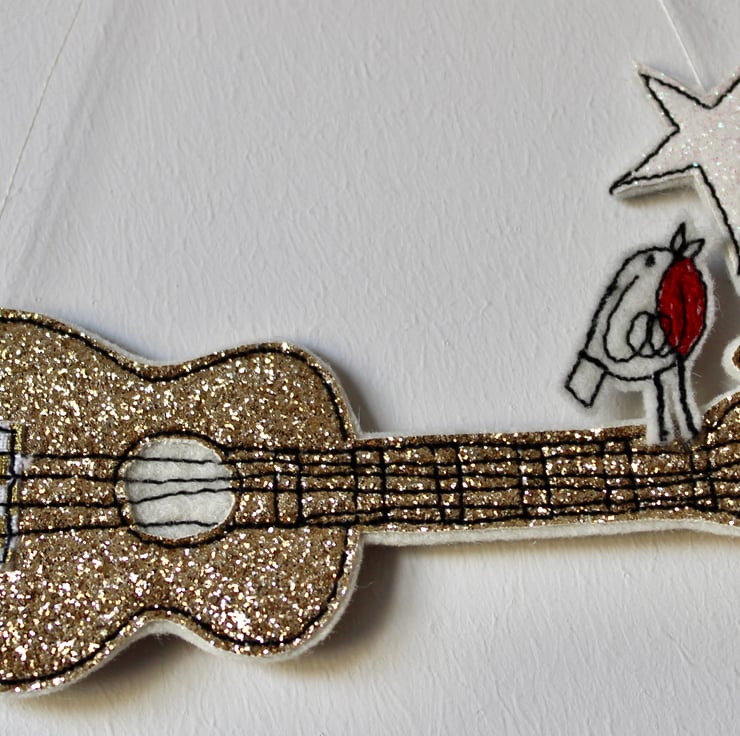 Guitar with a robin and star is created using 100% cream wool felt, glitter fabric, free hand machine embroidery and cut out by hand using a very sharp pair of scissors.