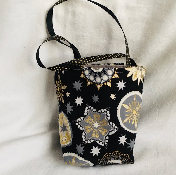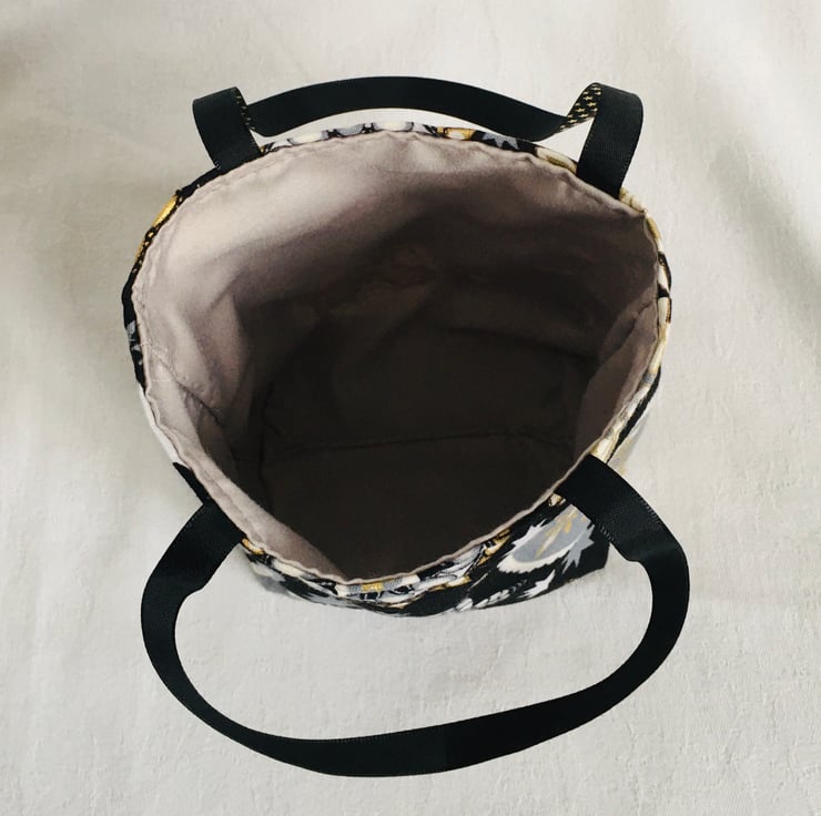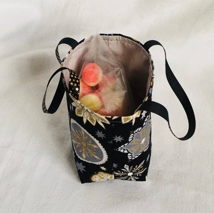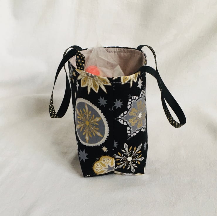 The bag has been made using tight weave quilting cotton and fully lined in a plain colour cotton, finished with ribbon as carry handles, ready to present.