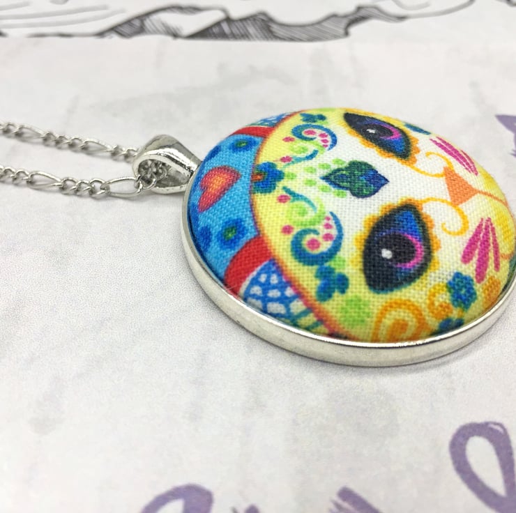 I love to create Halloween or Day of the Dead jewellery and I also love Cats! Well, when I saw a remnant of this amazing colourful cat face sugar skull fabric, I just had to get it! So much beautiful details and different cat faces on here, the opportunities for jewellery are endless!