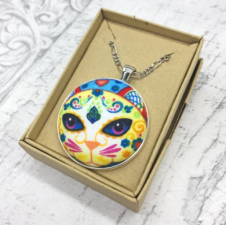 Not just for Halloween, this lovely unique pendant will come to you safe and carefully packaged in a UK Made eco-friendly recycled kraft card jewellery box (hand-folded by me!) - perfect for lovers of cats to wear all year round, or Day of the Dead and Halloween jewellery (or as a treat for yourself!)