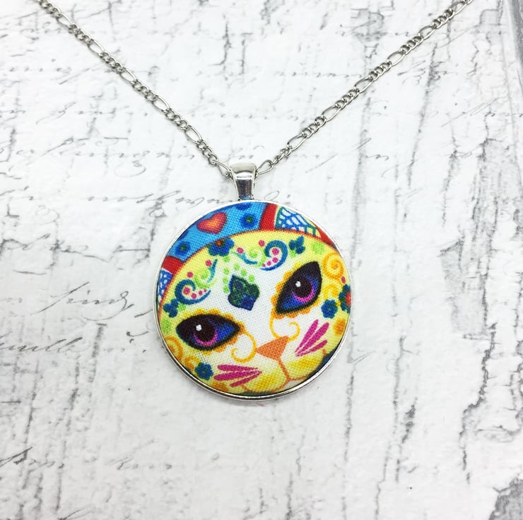This is an amazing find - A Cat face sugar skull Day of the Dead 100% cotton fabric pendant, Perfect for Cat lovers!