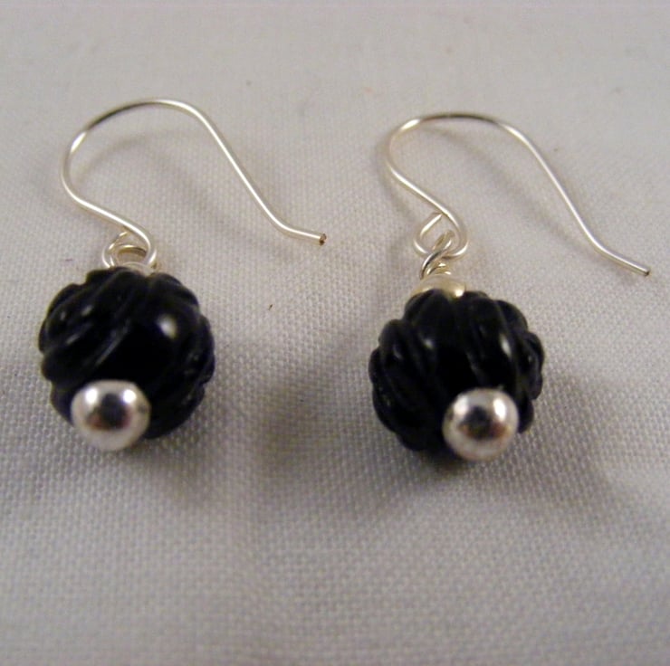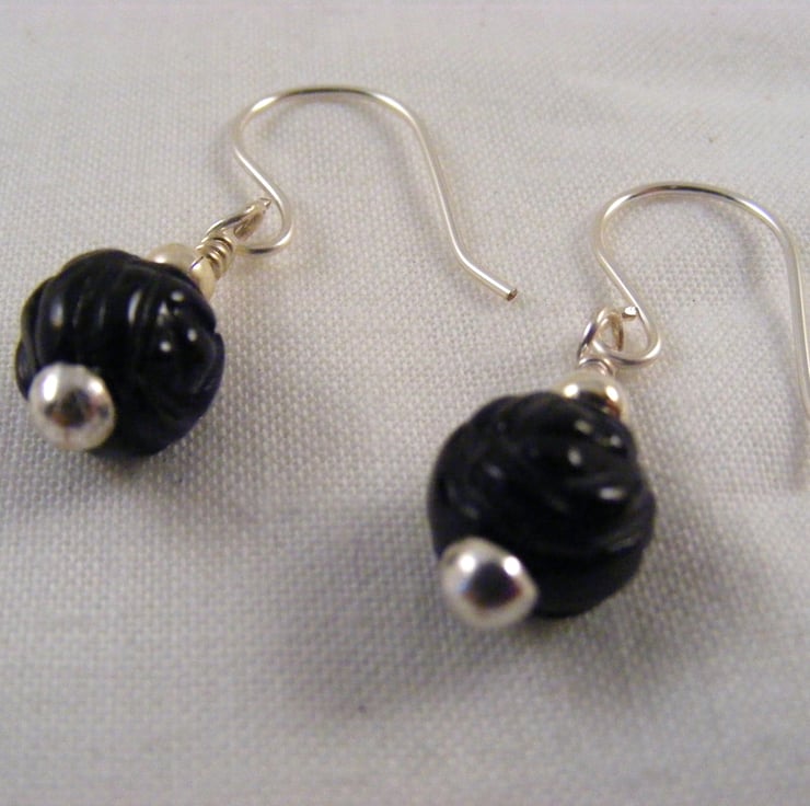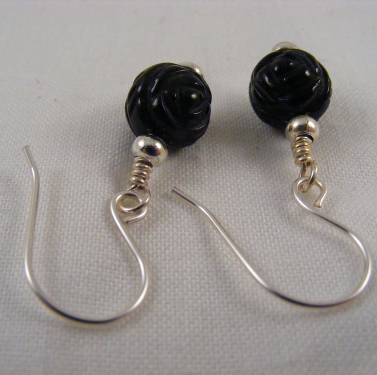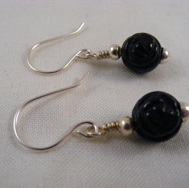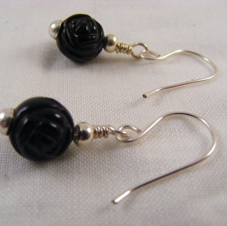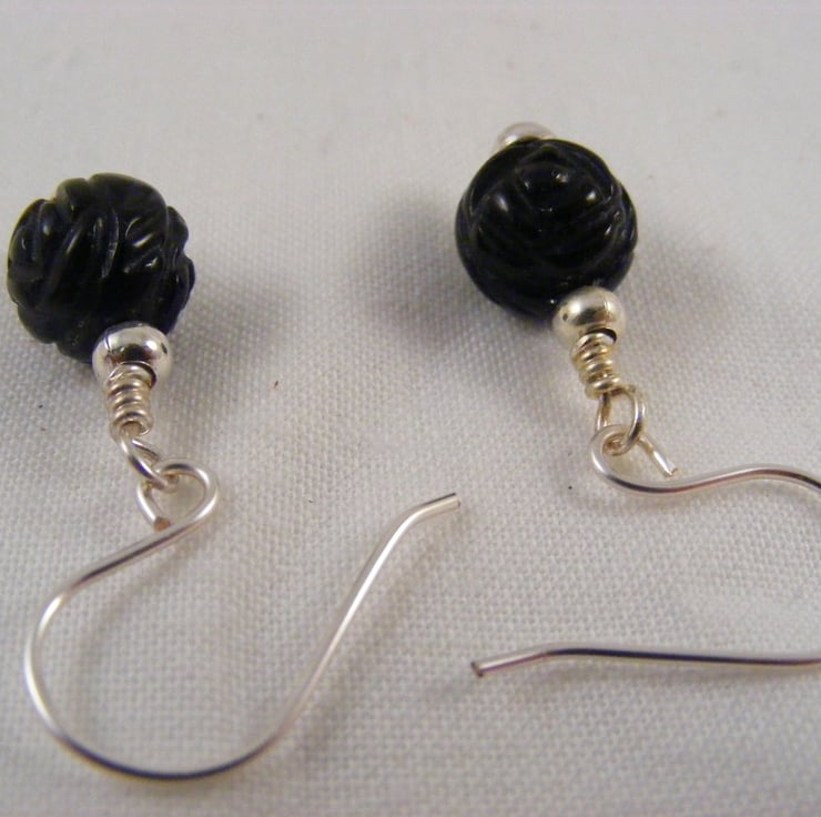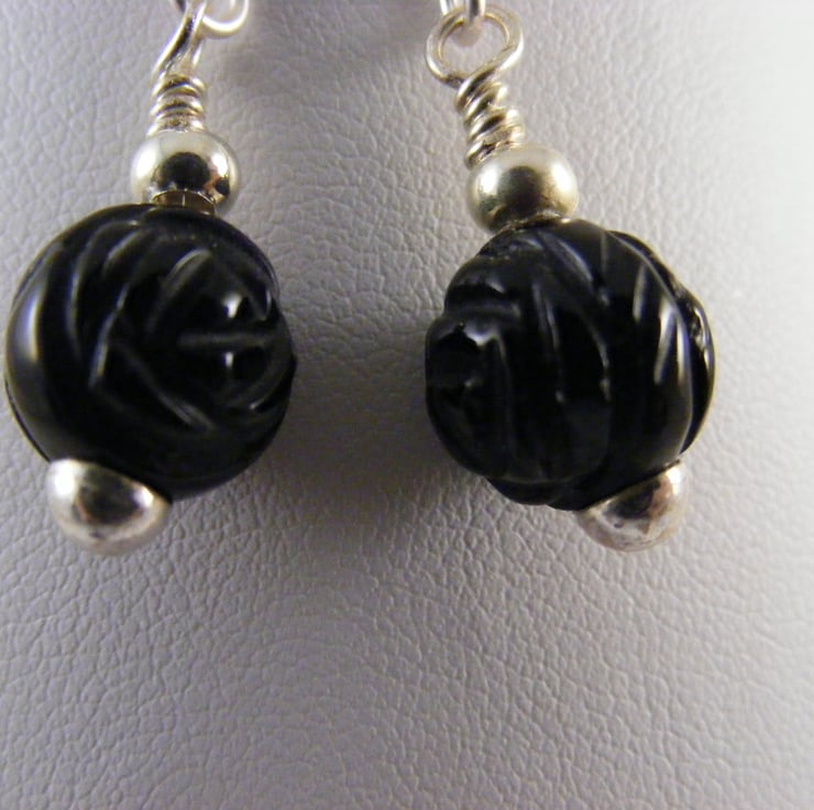 Handmade, one of a kind gemstone earrings made with, 10 mm black agate carved flower beads, 3 mm silver plated spacer beads, silver plated headpins, handmade silver plated ear wires.