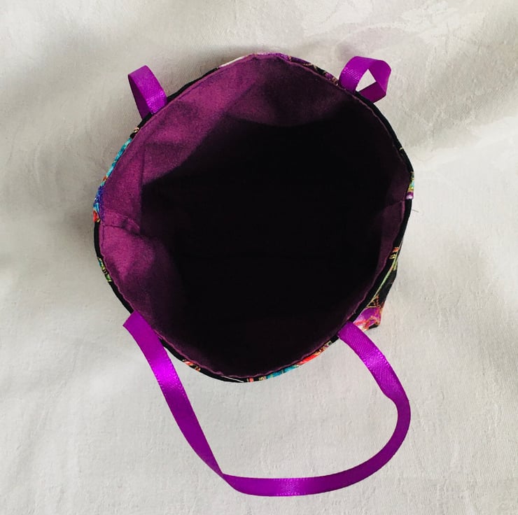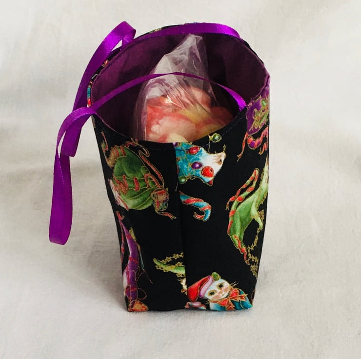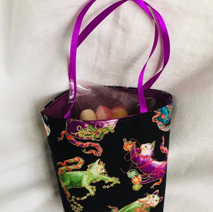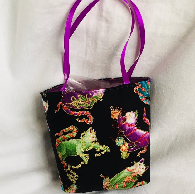 The bag has been made using tight weave quilting cotton with Cats playing with the Christmas decorations and fully lined in a plain colour cotton, finished with satin ribbon as carry handles, ready to present.