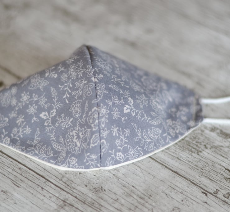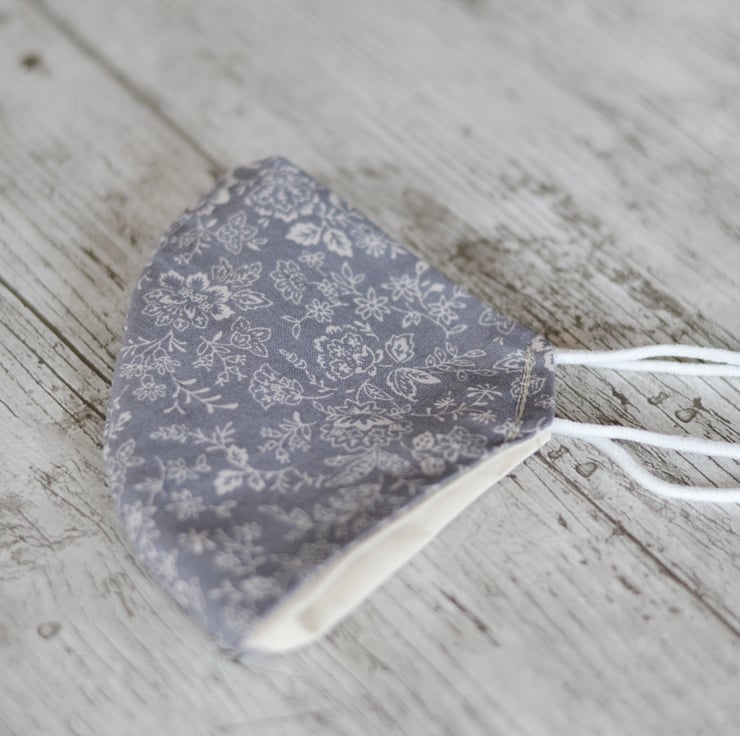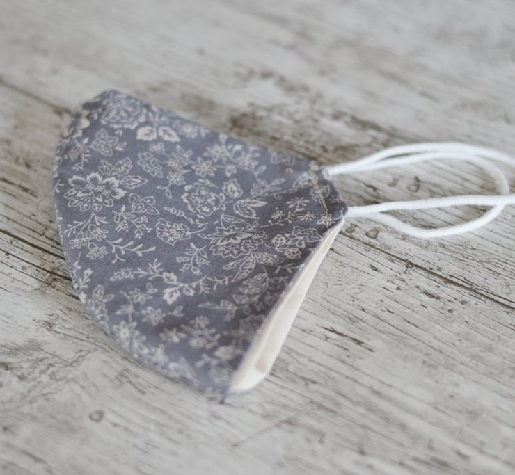 100% 2 layer cotton face mask. Made in a lovely pewter grey fabric with a light grey flower on it. It is lined with a cream plain fabric. Soft white elastic that doesn't hurt the ears.