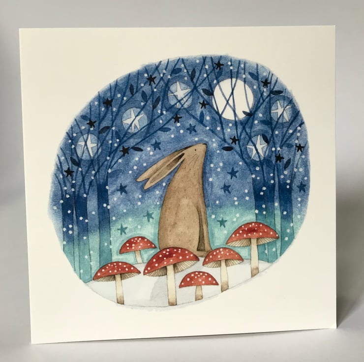 A 125mm square card printed on 300gsm board taken from an original illustration by Three Acorns and supplied with ivory pearlescent envelope. This design is suitable for Christmas or Winter birthday and is blank inside.