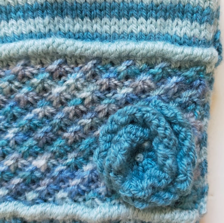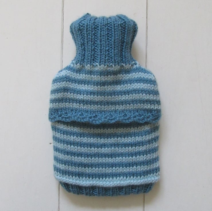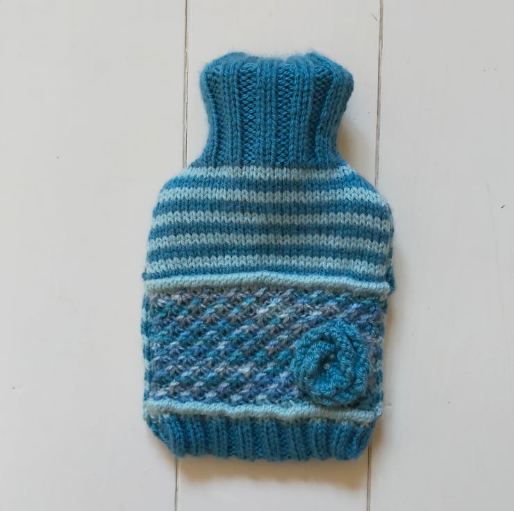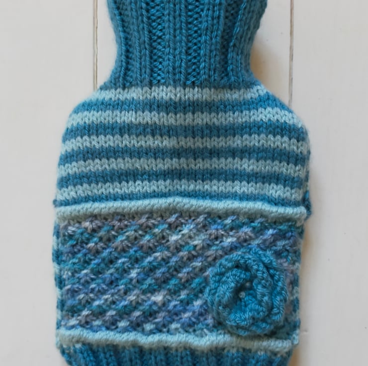 A wonderful hot water bottle cover hand knitted in soft muted colours. The front of the cover is knitted in soft blue narrow stripes using duck egg blue and slate blue coloured yarns with a blue melange lace daisy stitch panel edged with a duck egg blue tuck row top and bottom, sewn securely on the panel is a matching slate blue rose flower. The bottom edge of the cover is knitted in a rib using petrol blue coloured yarn so the cover fits nicely around the bottle. The neck is also hand knitted in rib using slate blue coloured yarn. The back of the hottie is knitted in matching narrow stripes in duck egg blue and petrol blue. The traditional envelope opening is edged in a hand knitted picot edging using the petrol blue yarn.