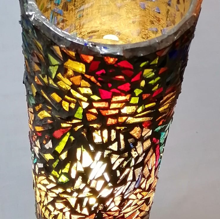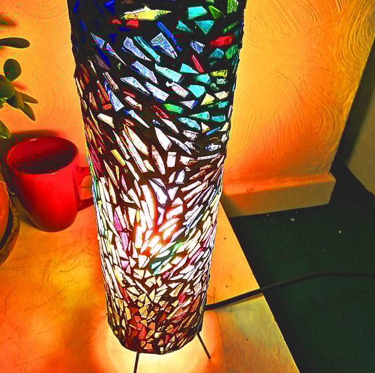 This vibrantly coloured jewel like mosaic lamp depicts the energy flow and movement of dancer. It is cylindrical about 42 cm height by 12 cm diameter and is made from upcycled jars and coloured glass. It comes with a bulb, an electric lead, safety switch and plug.
