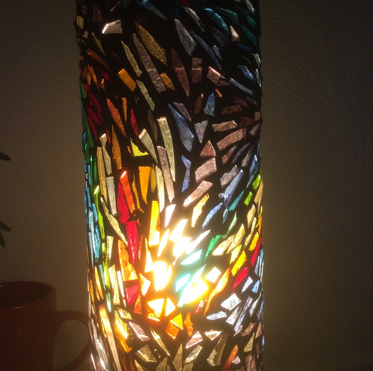 I have always loved dancing. I have been involved in dance groups and performing over the years but havent done much lately! I went through a phase of sketching dancers in pubs and nightclubs and trying to capture the energy and joy of a person dancing which had been the inspiration for this this lamp. The vibrant range of colours and tiny tessarae have been placed in patterns to communicate the flow and energy of a dancing figure and their surroundings.