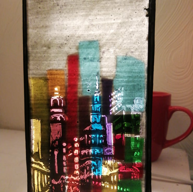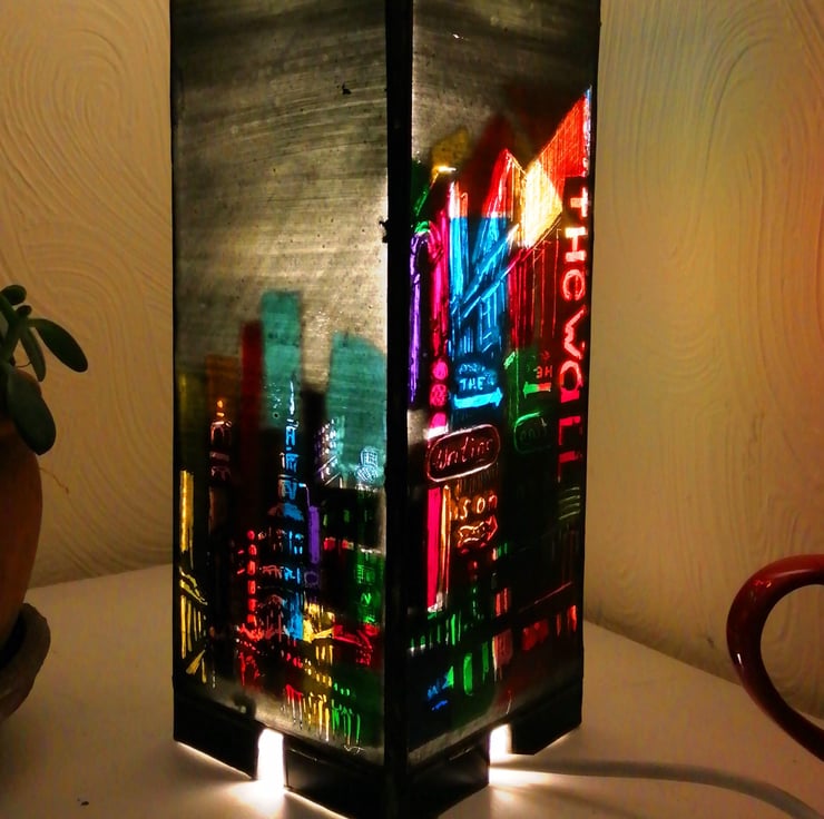Neon City Scape Lamp depicts the vibrant colours of neon lights in a city at night time against the shadow of skyscrapers in the background. The four sides of the cube shape lend themselves to the different perspectives of a city creating an impression of turning into a new street as you view each side of the lamp. This makes a beautiful illuminated centre piece feature to a living space and warms up a room on a cold, dark evening. It is sized 20cm x 10cm x 10 cm and comes with a bulb, electric lead, safety switch and plug.