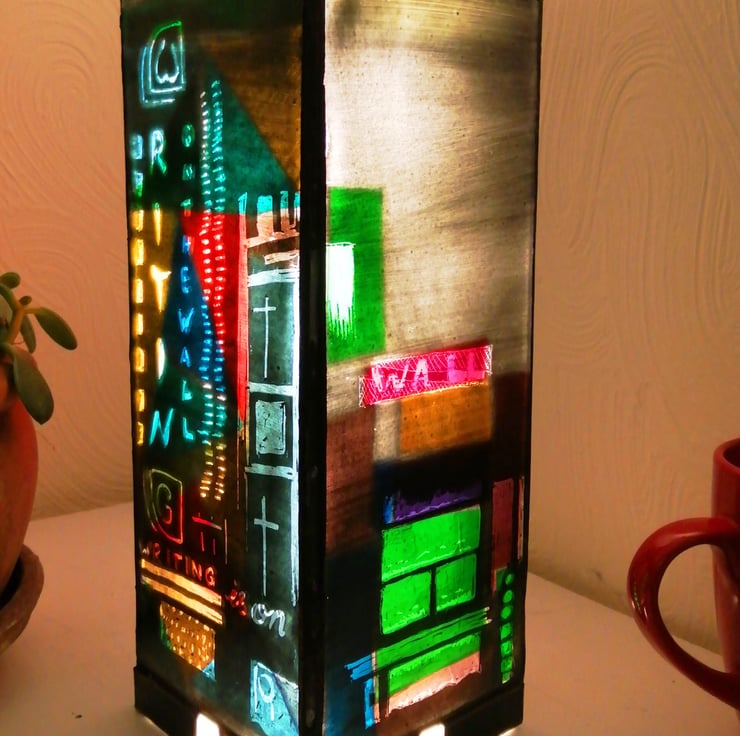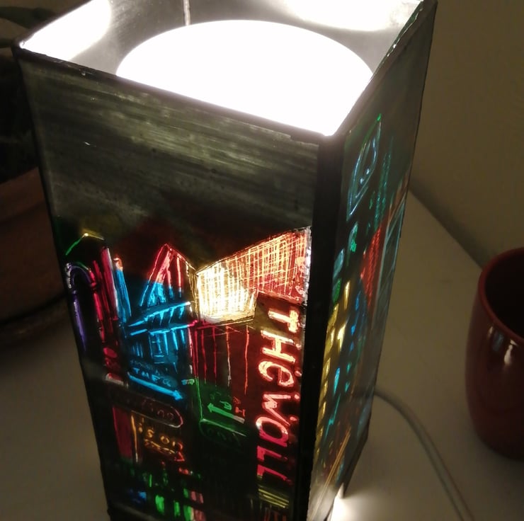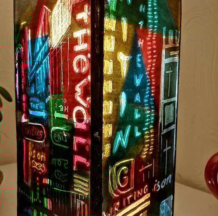 I have always loved viewing city lights at night from as long as I can remember and have often tried to capture the magic of the way in which the lighting defines the landscape at night in my artwork. When I visited cities in the Far East, I specially loved the jamboree of vibrant colourful Neon words and symbols which adorned many city streets and were an inspiration for this lamp along with the idea of using the words to create hidden messages - look more closely..