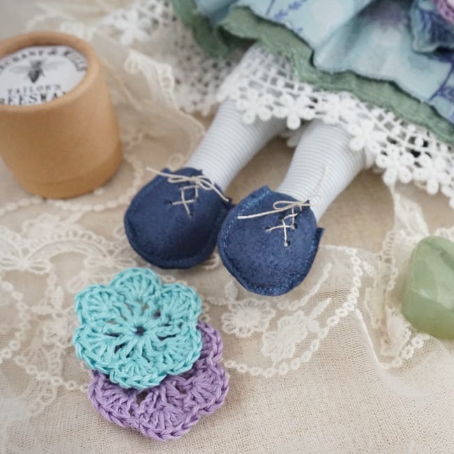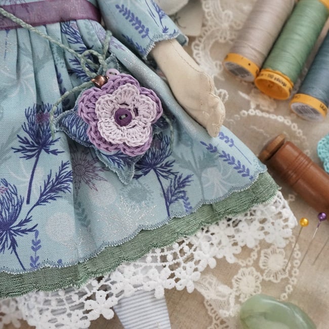 She is dressed in Iona a wonderful rich Lewis and Irene print in shades of aquamarine, purple and silver, finished with a purple organza ribbon. Her outfit is completed with tiny buttons, leather shoes and crochet flowers on her little sachet. She has co-ordinating knickers and underskirts in cotton and lace.