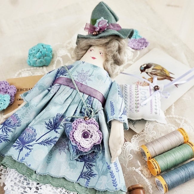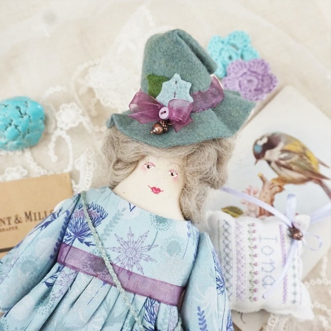 If you come from Lancashire and you make dolls, well you are going to make a witch doll. I love my little witch dolls, they are not remotely wicked just sweet hedge witches that are kind and gentle. Iona is a lovely fabric, touched with a little dusting of silver just sitting at the edge of winter.