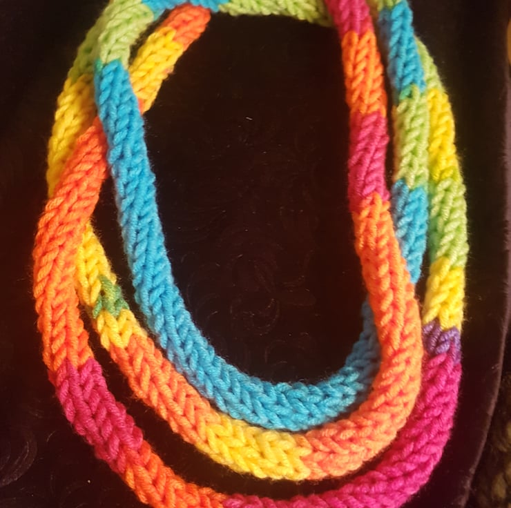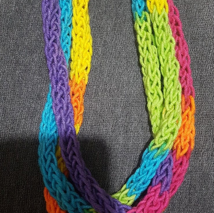 hand knitted rainbow scarf its one circular piece can be wrapped around how you like lightweight but cosy adds a bit of colour and brightness to a dull wardrobe. I wear a lot of plain colours myself especially as we go into autumn winter, so it really appeals to me. I also have one.