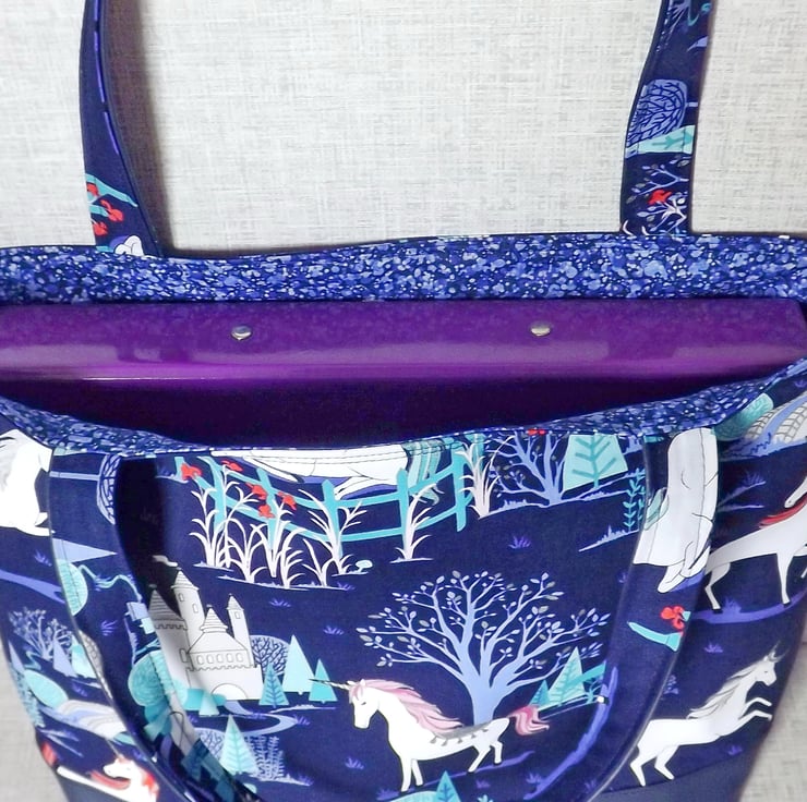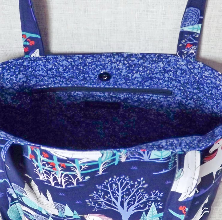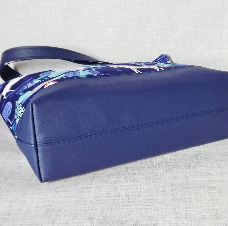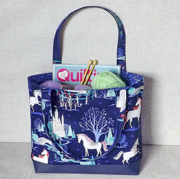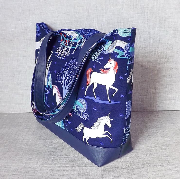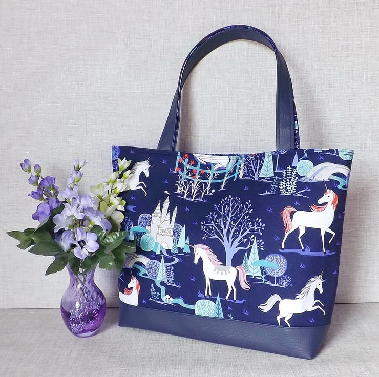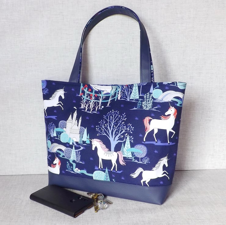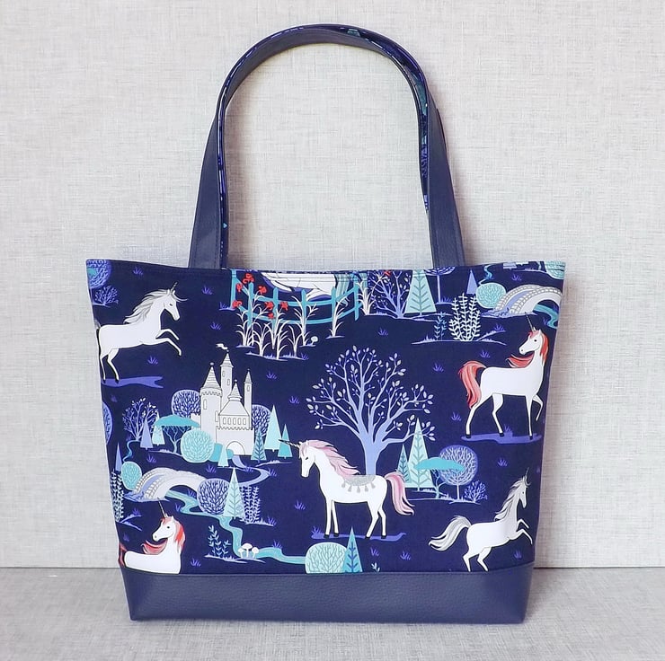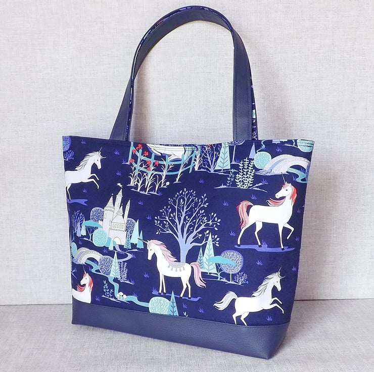 A tote bag made from a cotton fabric with unicorns, castles & trees in shades of grey, turquoise and white, on a blue background, combined with navy blue faux leather.