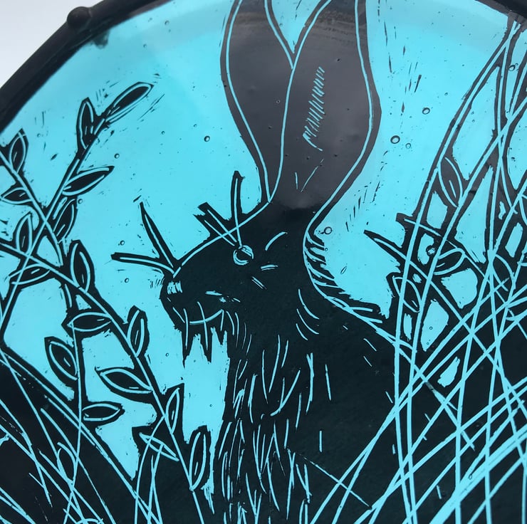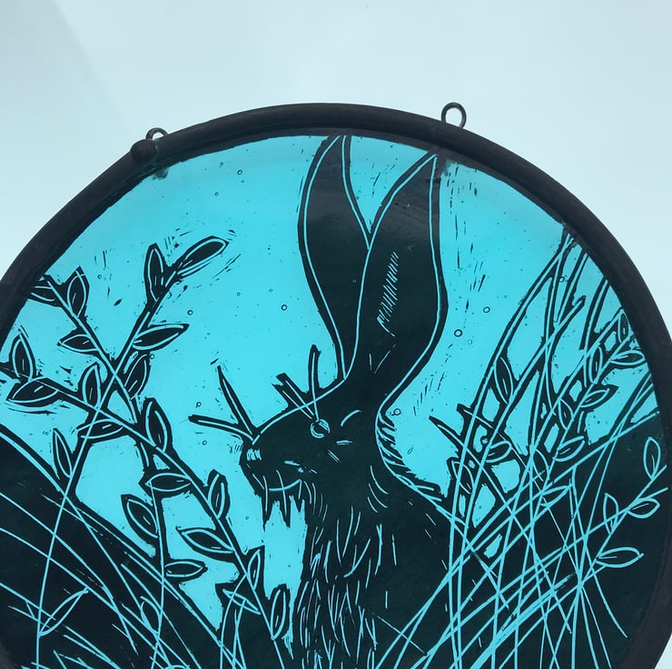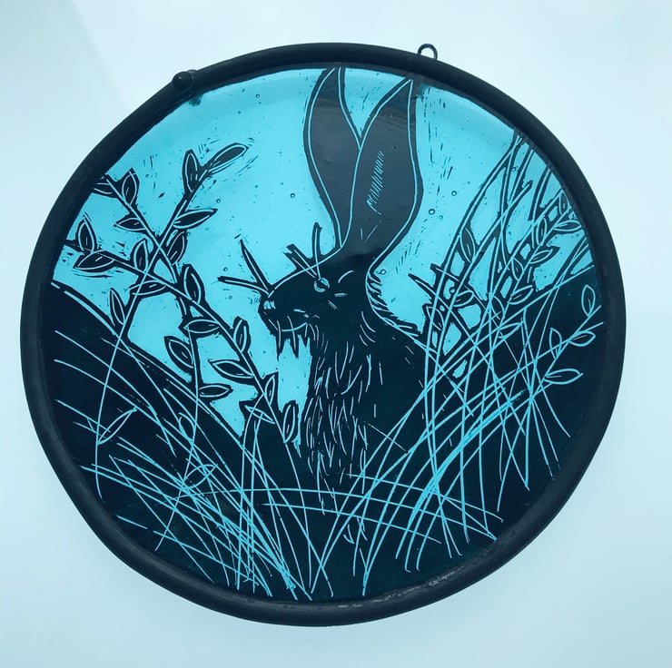This stained glass circular panel features are very handsome and mischievous hare. You just know he's looking for trouble amongst the long grass.