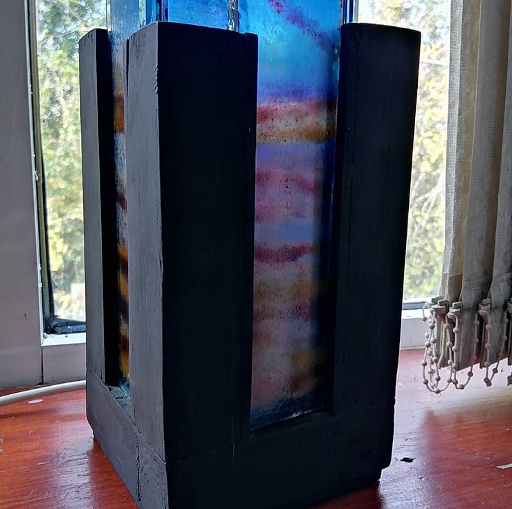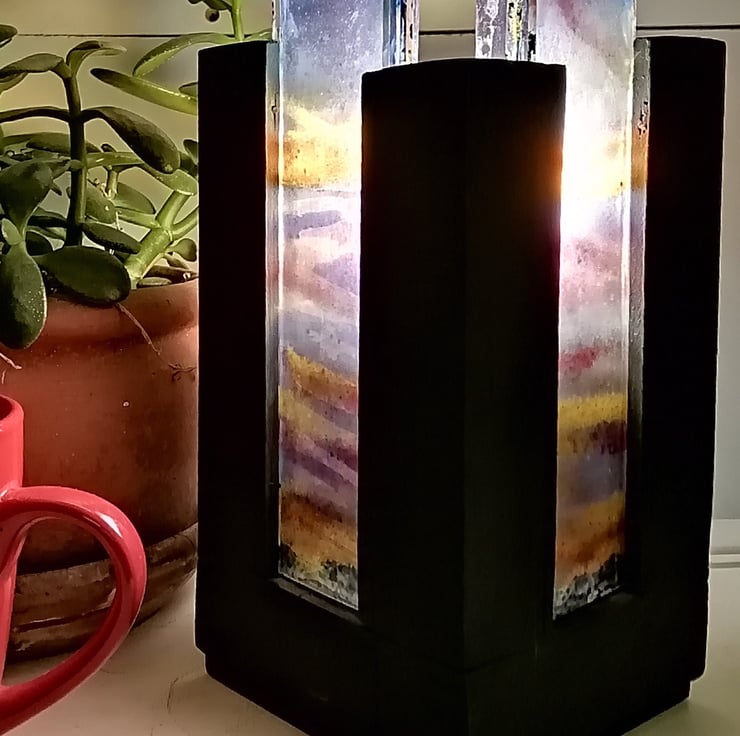 This cube shaped lamp depicts a skyscape seen through skyscrapers. On each side, there is a four layer thick enamel painted image of the sky designed with a slightly differernt image on each layer to depict the sky as a 3d image, and the wooden frame it sits in depicts skyscrapers. This makes an interesting feature piece for a room and its translucency picks up natural daylight, making it an attractive sculpture in the day as well as being a lamp at night. Its dimensions are 20x10x10 cm and it comes with a bulb, electric lead, plug and safety switch.