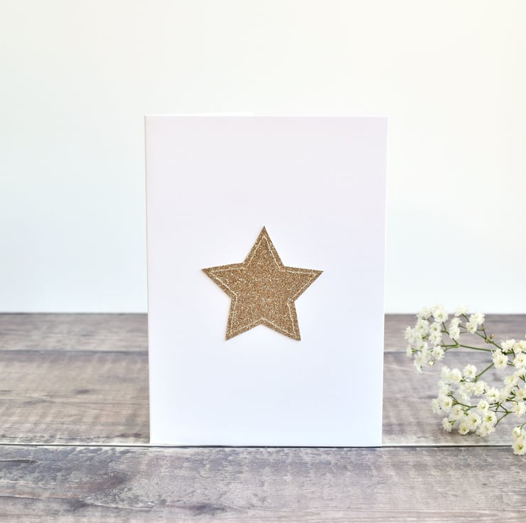 Made using gold glitter fabric stitched directly onto the front of the card using freehand machine embroidery.