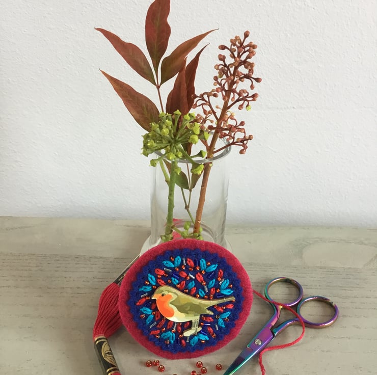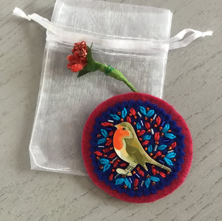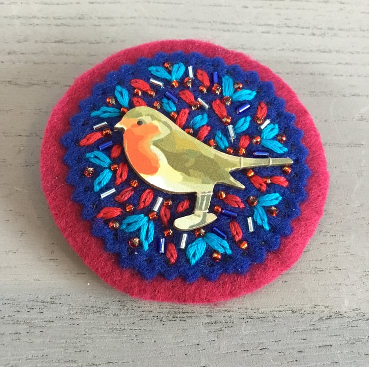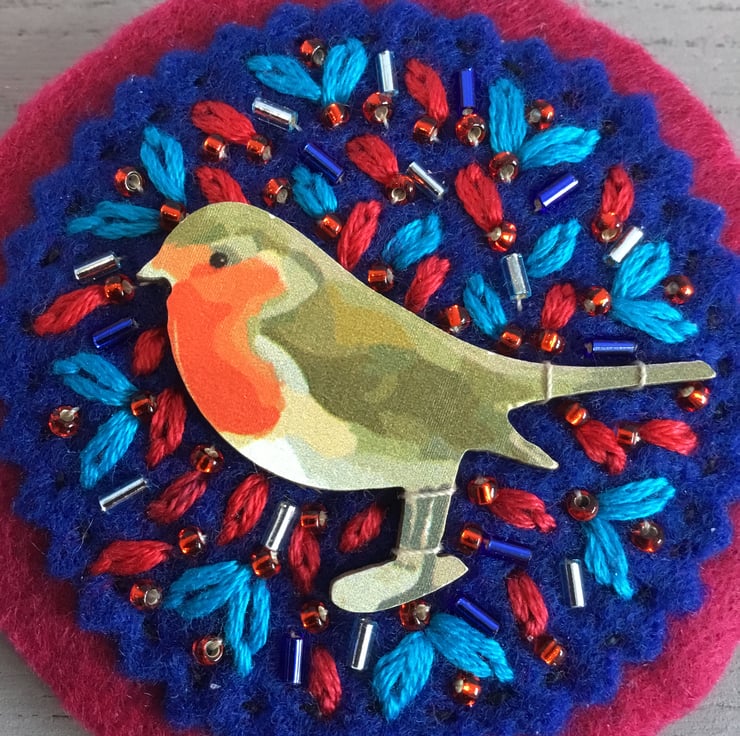 The cheery robin that visits my garden is a happy sight. The wooden robin bird motif in the centre of this hand embroidered brooch is a reminder of this cheerful bird. It sits on a background of blue and red felt surrounded by red and turquoise embroidery stitches and beads.
