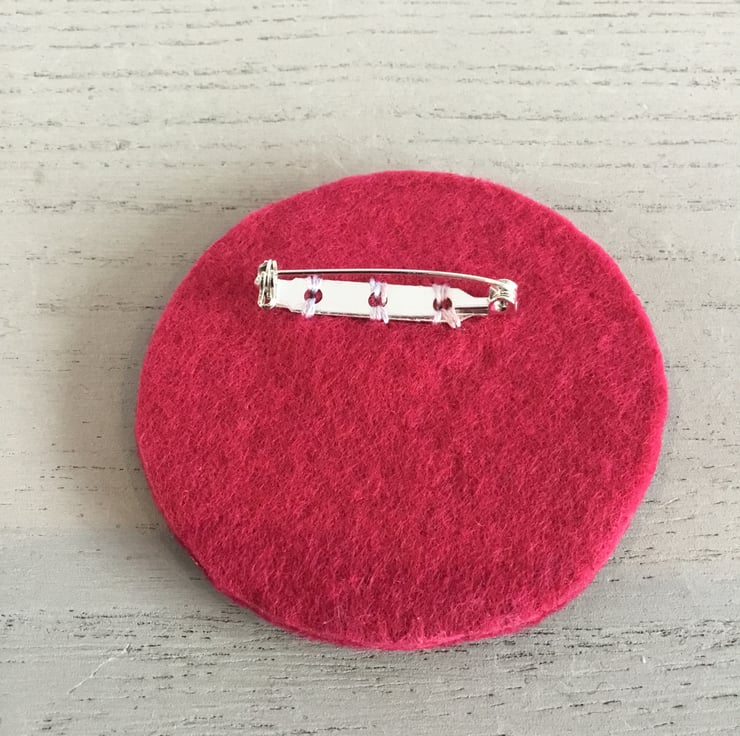 This brooch has a brooch pin with a safety catch sewn onto the back, for secure wear.