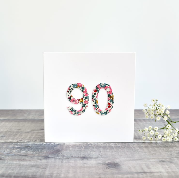 Made using pretty Liberty fabric the number ninety has been stitched directly onto the front of the card using freehand machine embroidery.