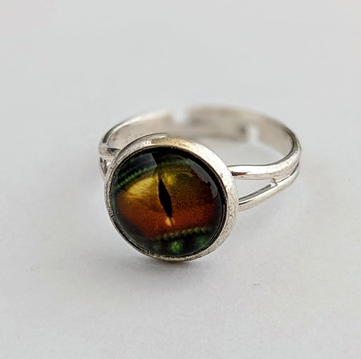 10mm green orange yellow lizard eye glass cabochon in adjustable silver plated ring setting. In an organza gift bag.