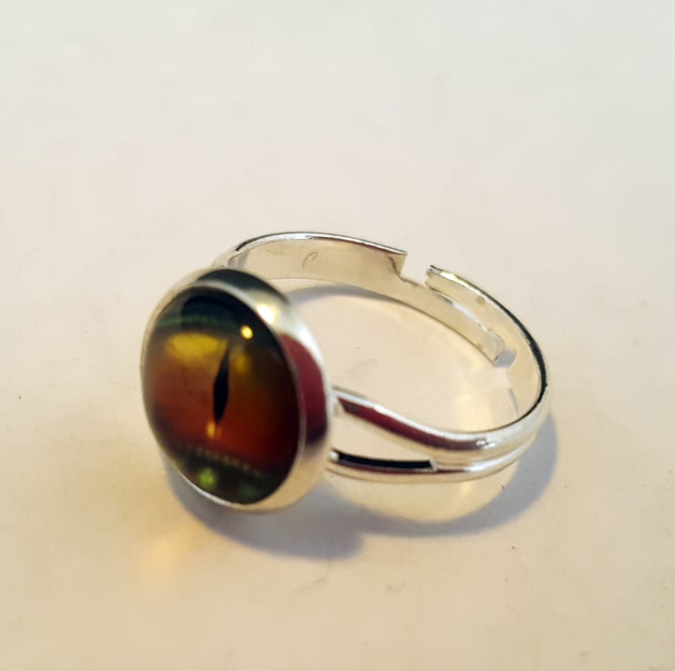 10mm green orange yellow lizard eye glass cabochon in adjustable silver plated ring setting. In an organza gift bag.