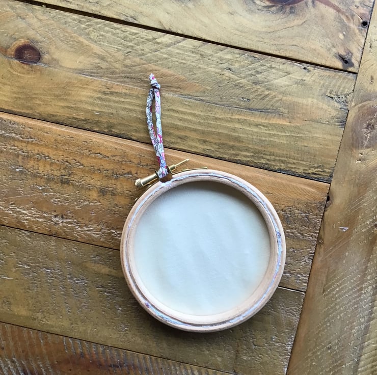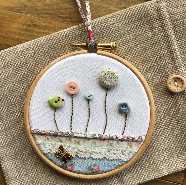 The button flowers are made from a fabric covered button, a vintage glass button, 2 hand made ceramic buttons and a heart button.The stems are made from twisted bronze wire. They are planted in a pretty floral cotton, Liberty fabric cord and lace fabric garden. The background is linen from a vintage tray cloth. The hanging loop is also Liberty cord.