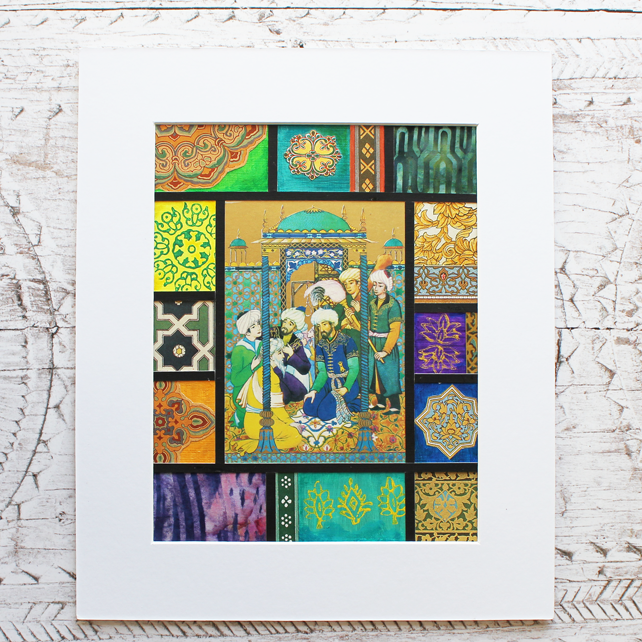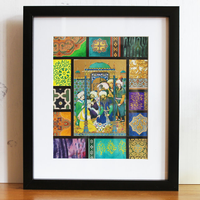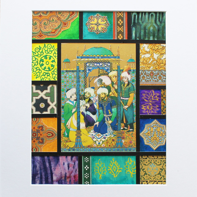 At the centre of this collage is a vintage Russian postcard with a wonderfully detailed illustration from The Arabian Nights.