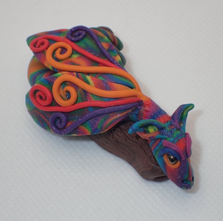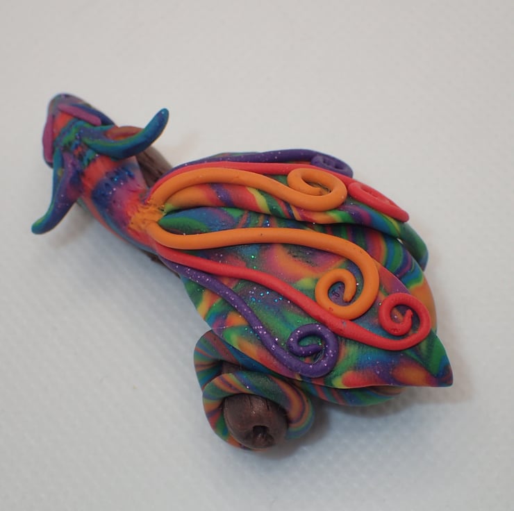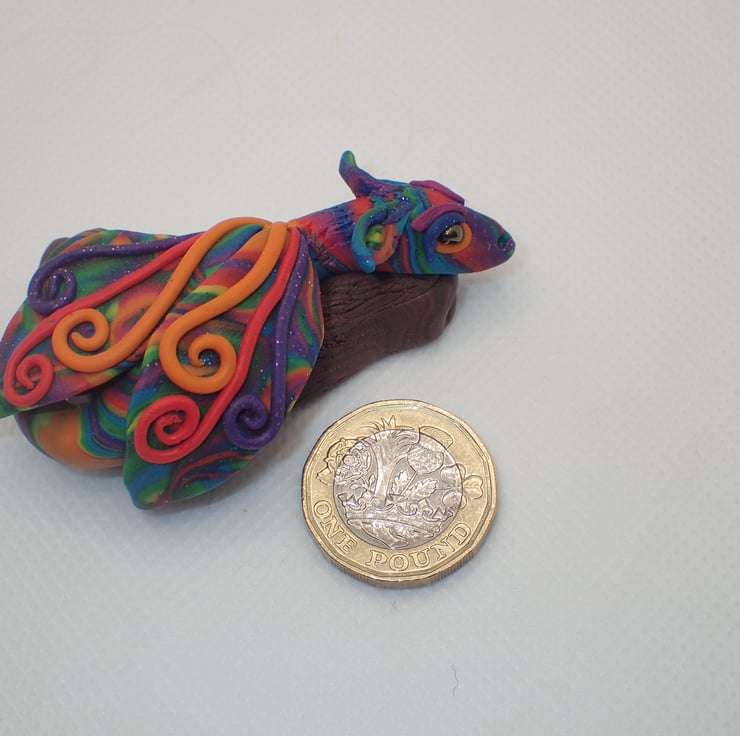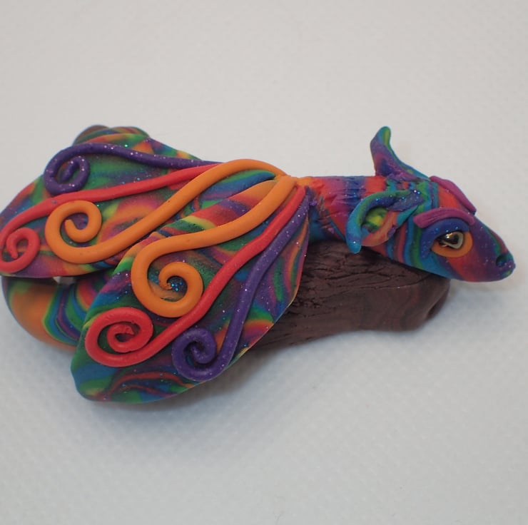 Little multicoloured rainbow dragon, sunbathing on a branch. 6.5cm long, 3.5cm wide and 2cm tall