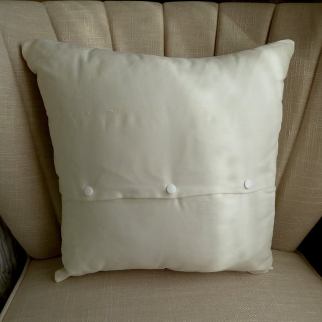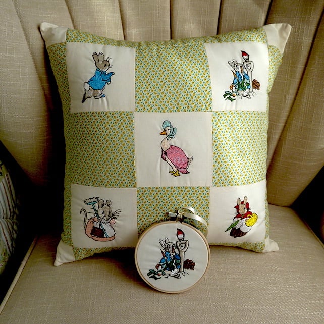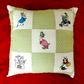 This cushion has been machine embroidered with Peter Rabbit, Clara Duck ,Mrs Tiggywinkle ,and Mrs Rabbit designs with alternate coloured squares.