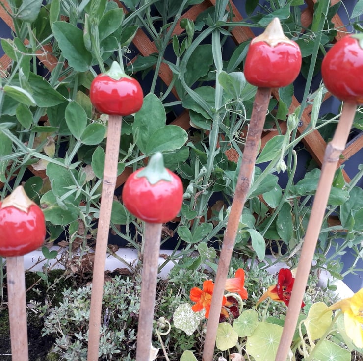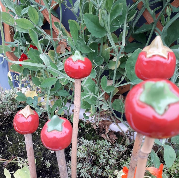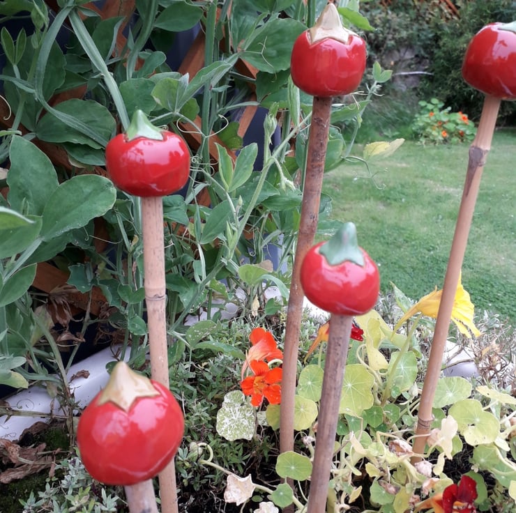 Cane Tops for your garden. Made from red earthenware clay, all glazed to suit the subject! Last for years and years in all weathers in your garden. These is the Tomato Collection. I use a variety of different bamboo canes to give a variety of hole sizes to fit bamboo canes.