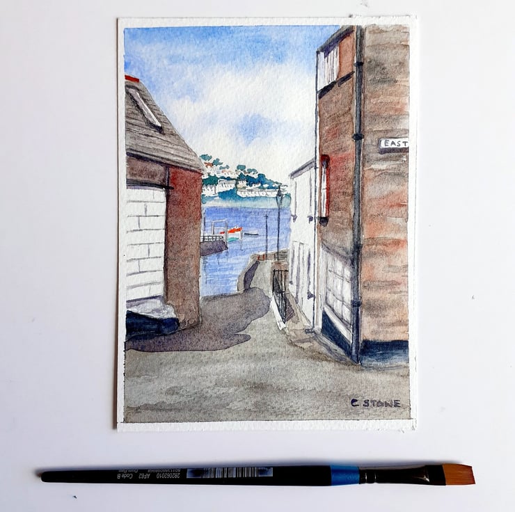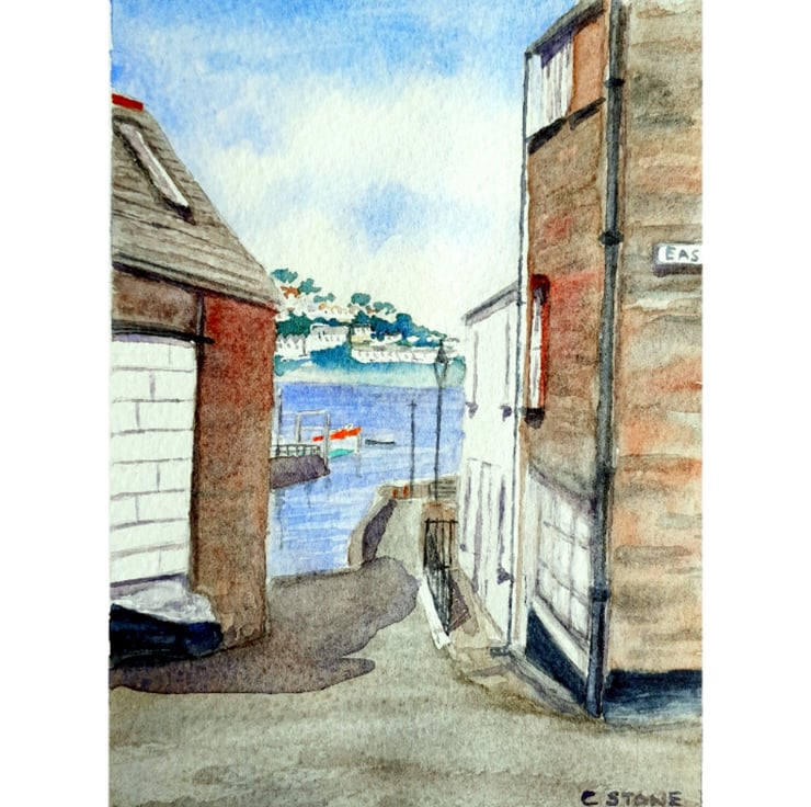 The painting is of Polruan in Cornwall, viewed from Fore Street towards the quayside.The town of Fowey lies across the water. From my own photograph, taken this summer.