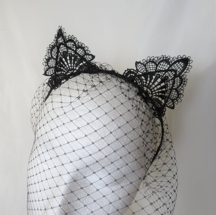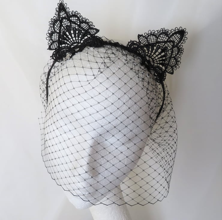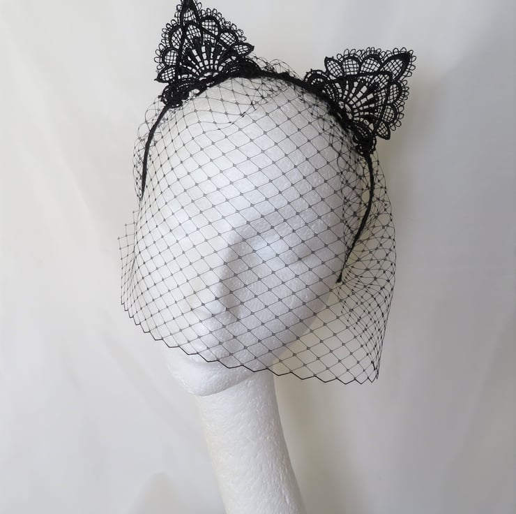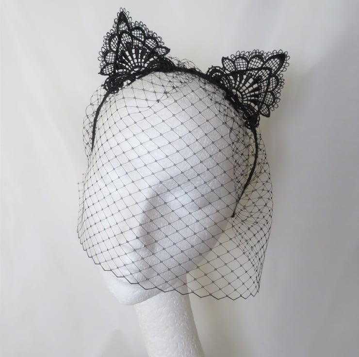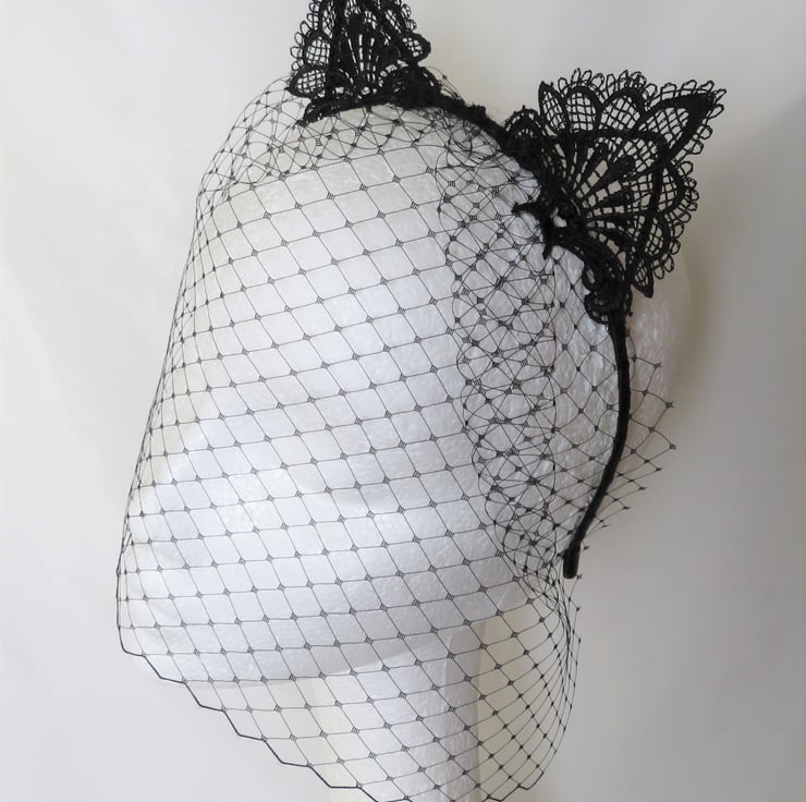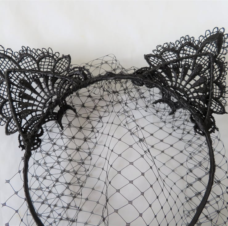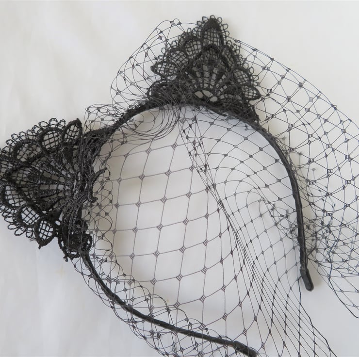 Made with a gathered piece of black classic veiling, hand sewn onto a metal headband, bound with black satin ribbon (bought in, not made by me) with ears covered with a lace applique.