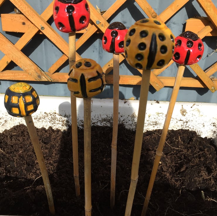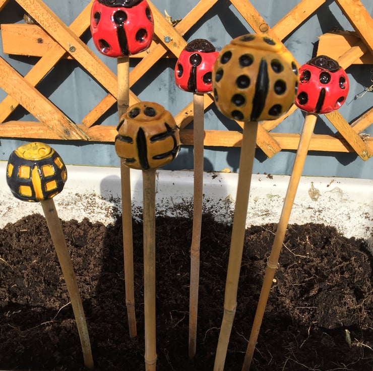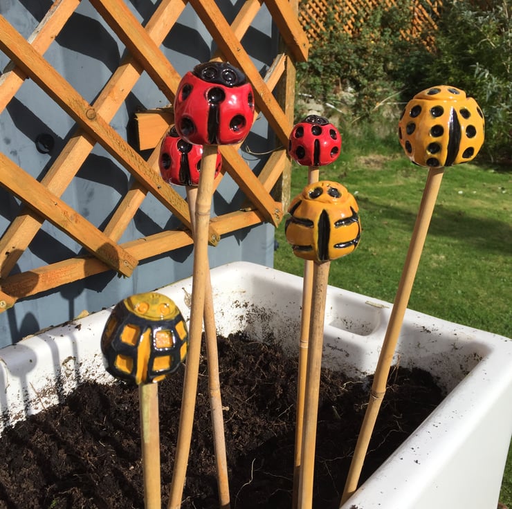 Cane Tops for your garden. Made from red earthenware clay, all glazed to suit the subject! Last for years and years in all weathers in your garden. This is the Ladybird Collection inspired by a customer who requested 22 and 14 spotted ladybirds and I discovered the beautiful yellow striped variety and the black and yello.. I use a variety of different bamboo canes to give a variety of hole sizes to fit bamboo canes.