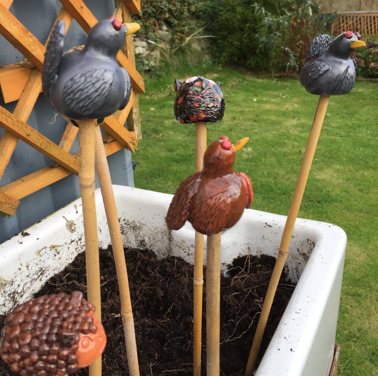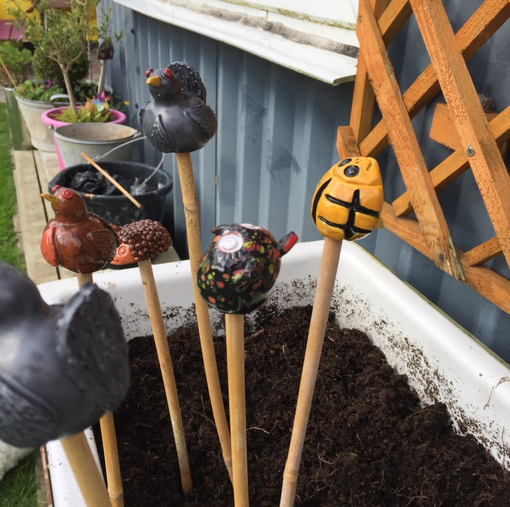 Cane Tops for your garden. Made from red earthenware clay, all glazed to suit the subject! Last for years and years in all weathers in your garden. This is my flying collection, 2 Blackbirds Mr & Mrs, Mrs Robin, Mrs Hedgehog, Mr Owl and Black Striped Yellow Ladybird. I use a variety of different bamboo canes to give a variety of hole sizes to fit bamboo canes.