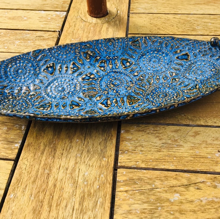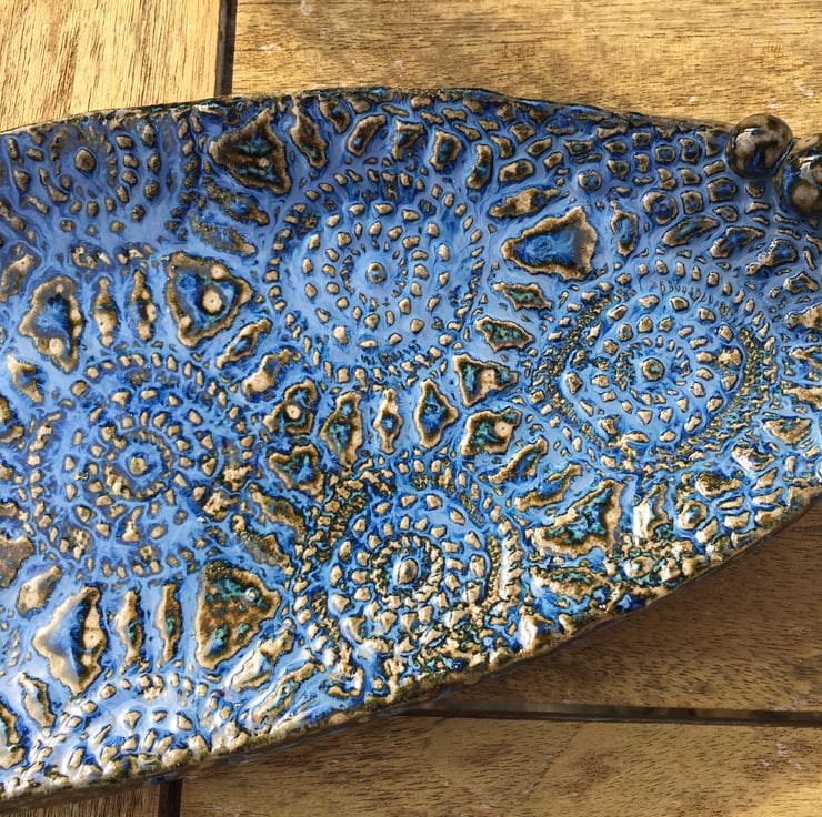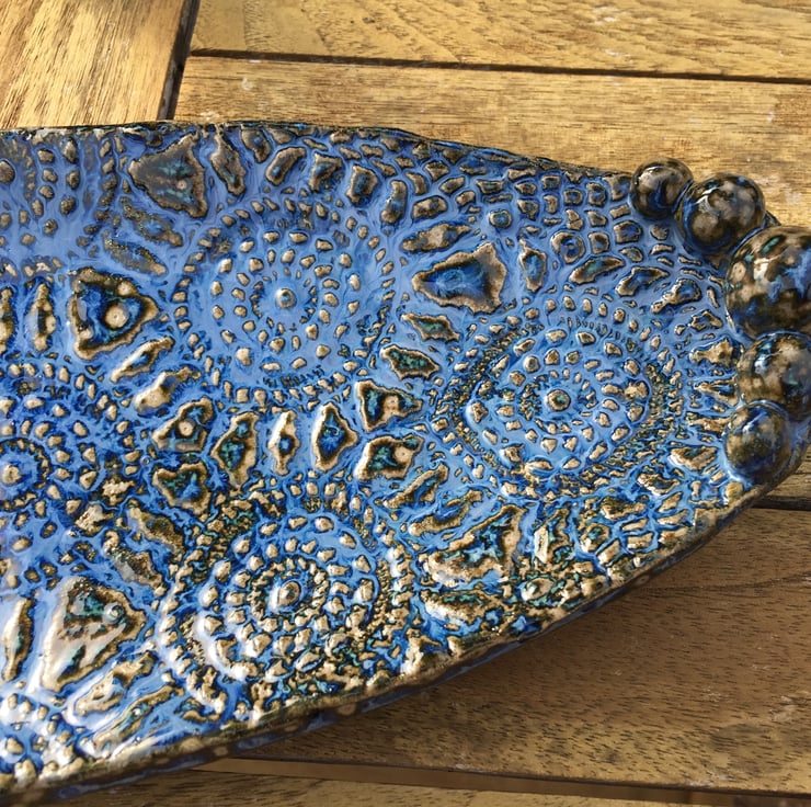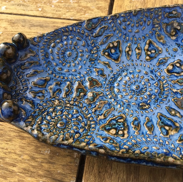 The blue glaze used on this textured clay produces a fantastic patina and blend of colours. Every time I use it I love it more and more.