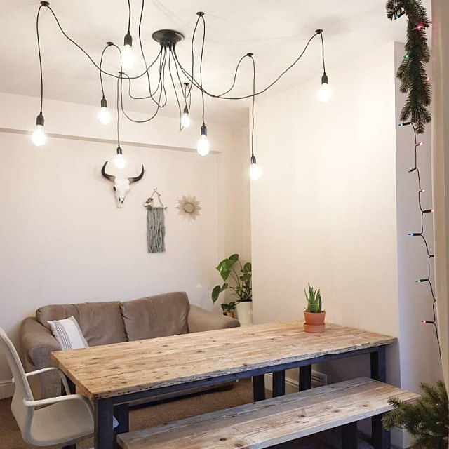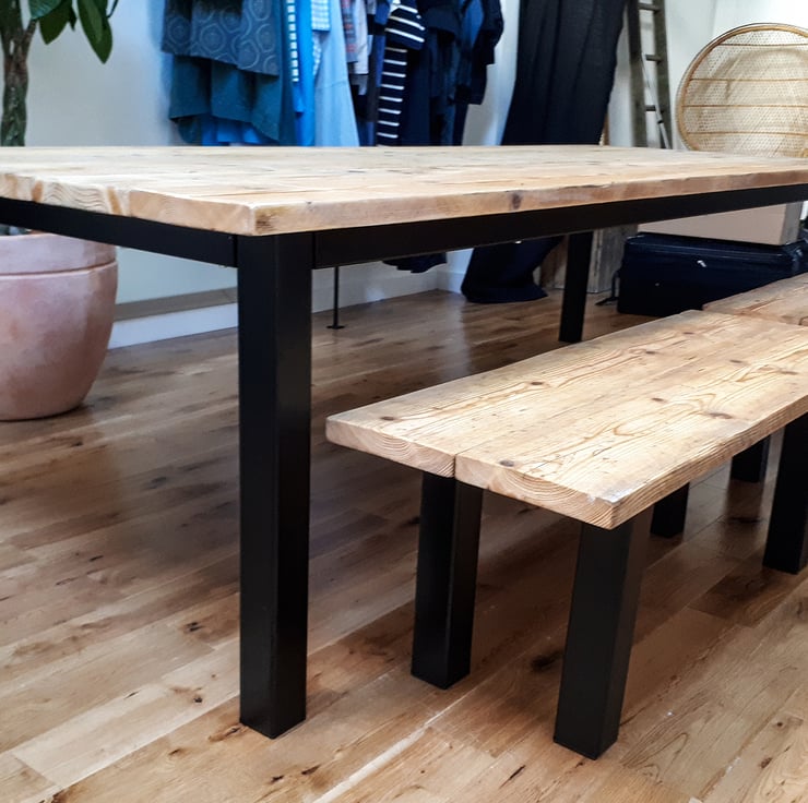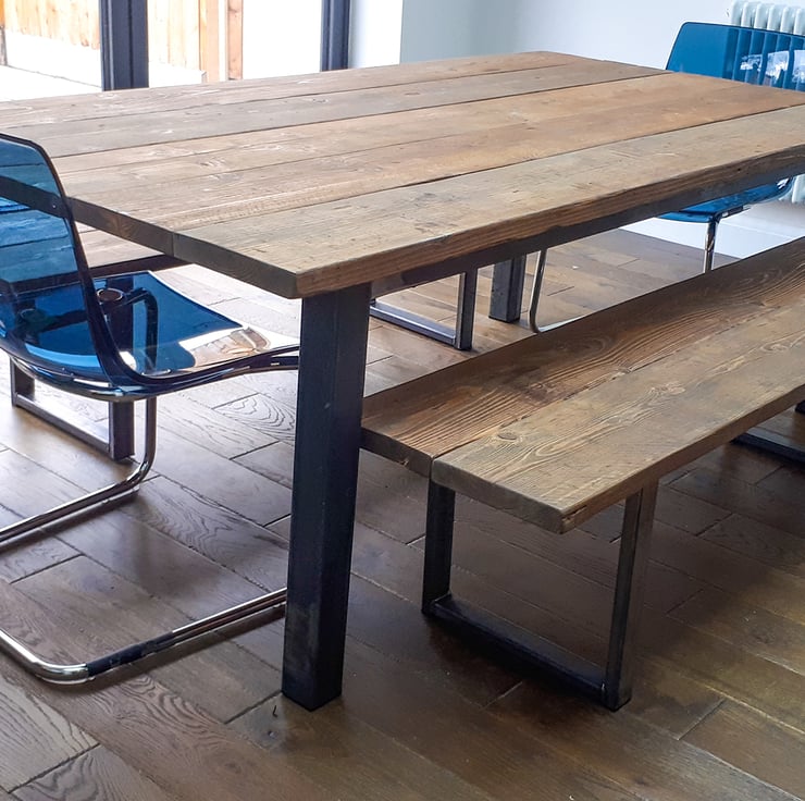 Chunky farmhouse style table constructed reclaimed scaffold boards with 50x25mm steel frame and 70x70mm legs.