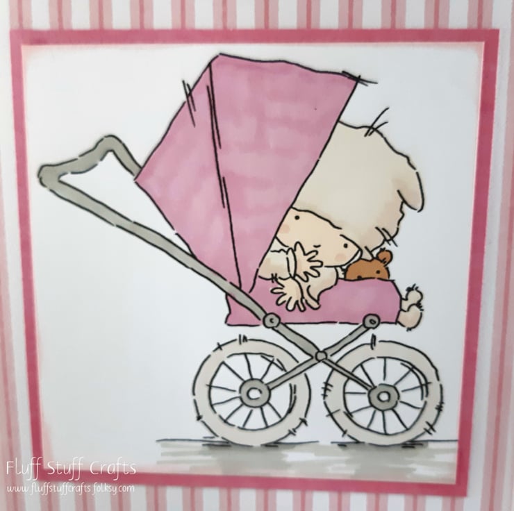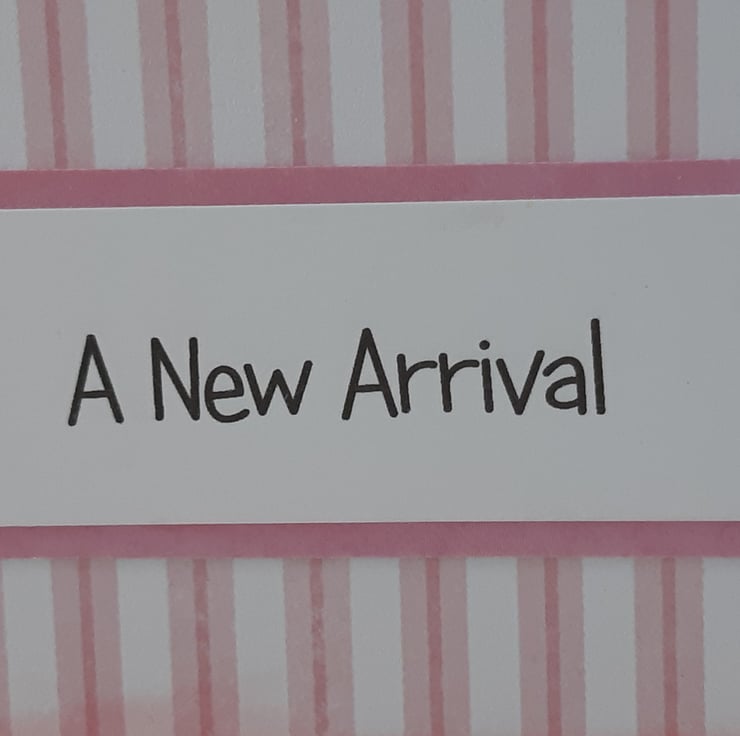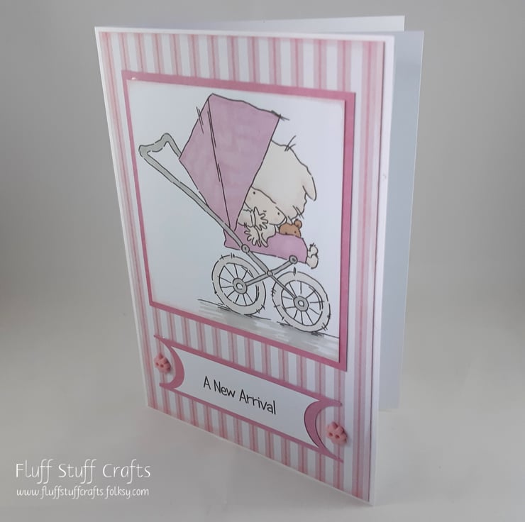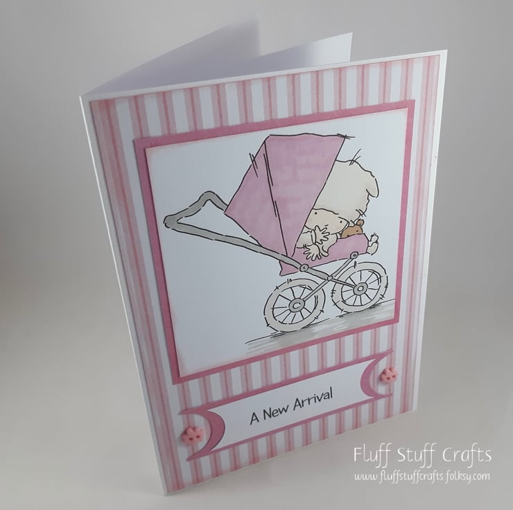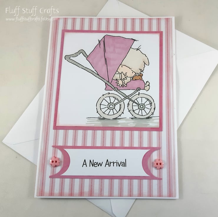 The image and the sentiment 'A New Arrival' have been framed with rose pink card over a pink and white striped background. The card has been embellished with two small, pink flower buttons.